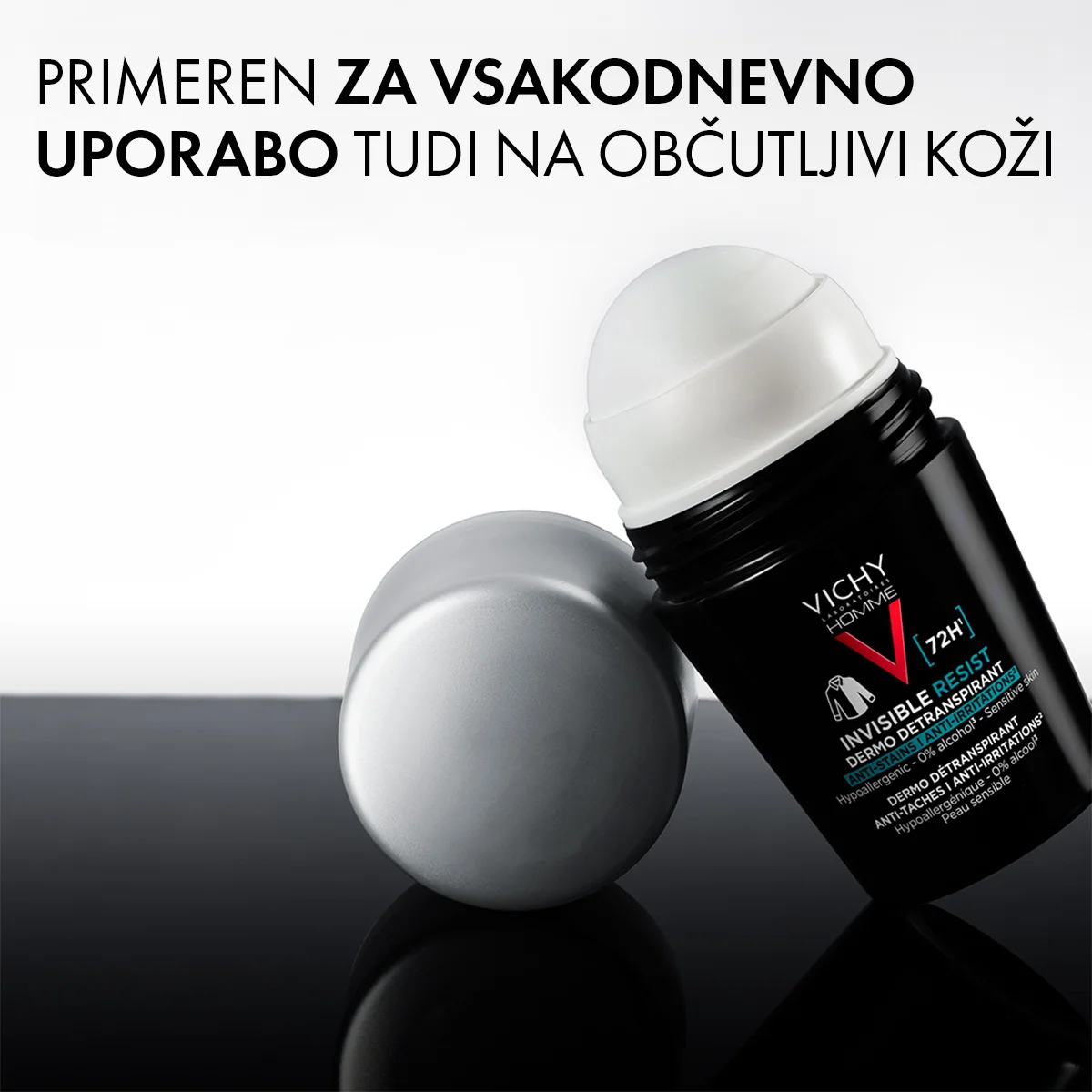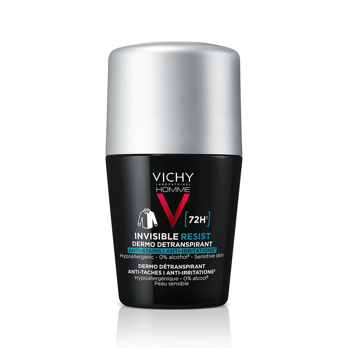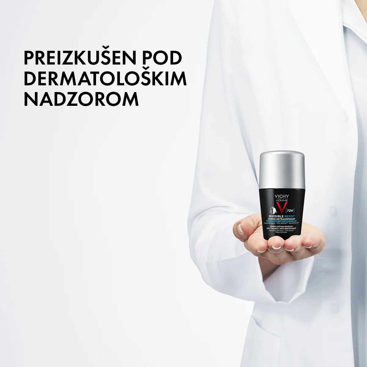 Vichy Homme Invisible Resist roll-on detranspirant nudi 72 ur visoke zaščite proti potenju in neprijetnemu vonju. Ima tudi dokazano učinkovitost proti madežem in bledenju barve na oblačilih. Tekstura je lahka, se hitro vpije in ne pušča mastnega ali lepljivega občutka.