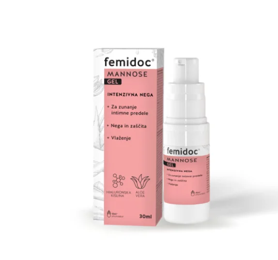 Femidoc Mannose, intimni gel z aloe vero, D-manozo, hialuronsko in mlečno kislino za nego in zaščito zunanjih intimnih predelov.