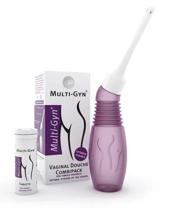 Multi-Gyn intimni higienski komplet vključuje ergonomsko oblikovano vaginalno prho in šumeče tablete za pripravo raztopine za izpiranje. Namenjen je preprečevanju vaginalnih infekcij in lajšanju težav, kot so srbenje, draženje, pekoč občutek, prekomeren izcedek in neprijeten vonj. Vaginalna prha je zasnovana za optimalno izpirananje v poljubnem položaju, posebna membrana preprečuje vsrkavanje tekočine ter nastanek pritiska, kar zagotavlja varno uporabo. Šumeče tablete iz naravnih sestavin podpirajo naravno ravnovesje intimnega predela in ne vsebujejo konzervansov ali parfumov.