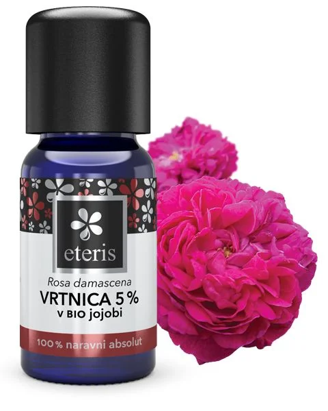 Favn eterično olje vrtnice 5 % absolut v BIO jojobi je naravni izdelek, pridobljen iz cvetov vrtnice (Rosa Damascena) z etanolno ekstrakcijo konkreta (absolut), razredčen v BIO jojoba olju. Eterično olje vrtnice je nepogrešljivo v parfumeriji, pogosto pa se uporablja tudi v kozmetičnih izdelkih za nego suhe, zrele in občutljive kože. V mešanici se dobro ujame z geranijo, jasminom, sivko, bergamotko in sandalovino.