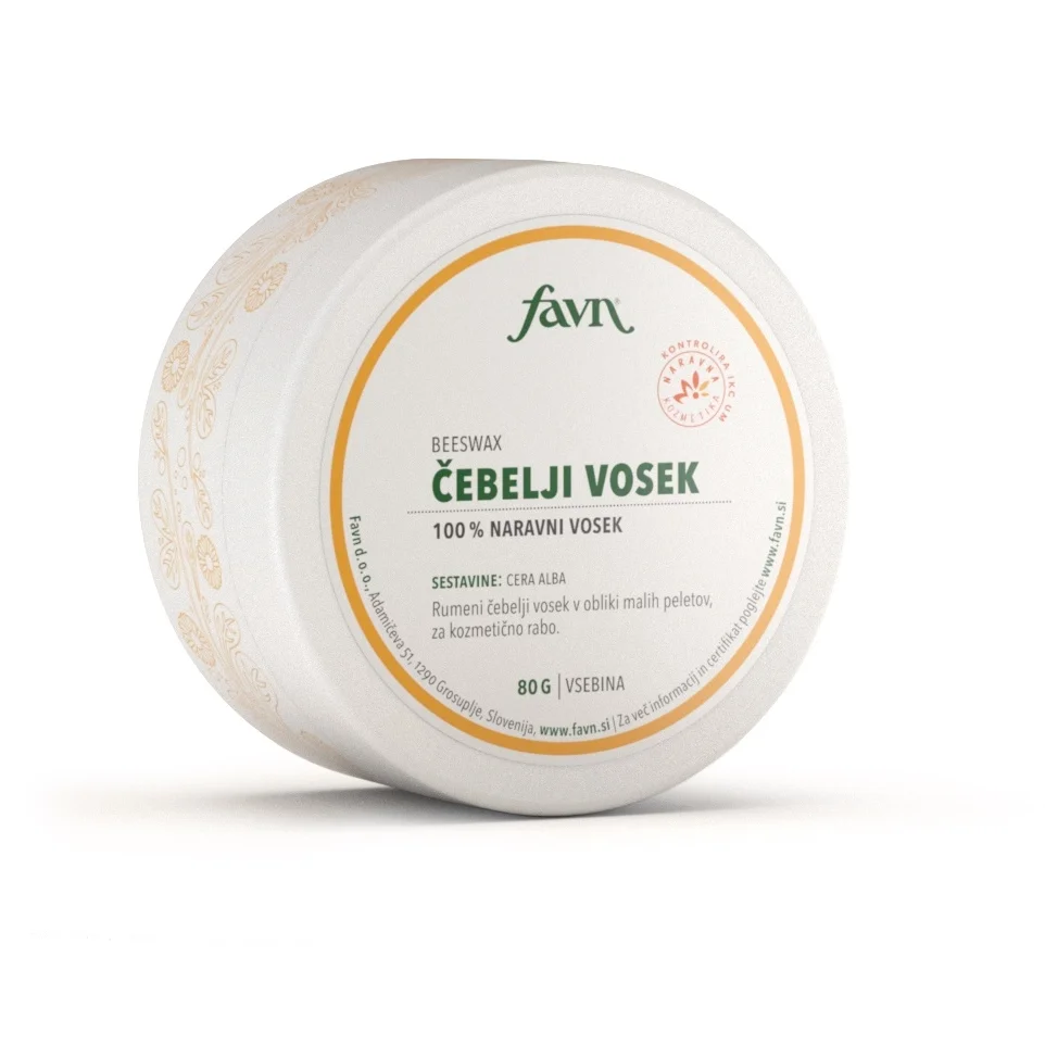 Favn Čebelji vosek je 100-odsotno naravno mazilo v obliki majhnih peletov, ki omogočajo enostavno doziranje. Namenjen je uporabi kot trdilec oziroma sredstvo za uravnavanje viskoznosti v domačih izdelkih, kot so zaščitne kreme za roke in mazila za ustnice.