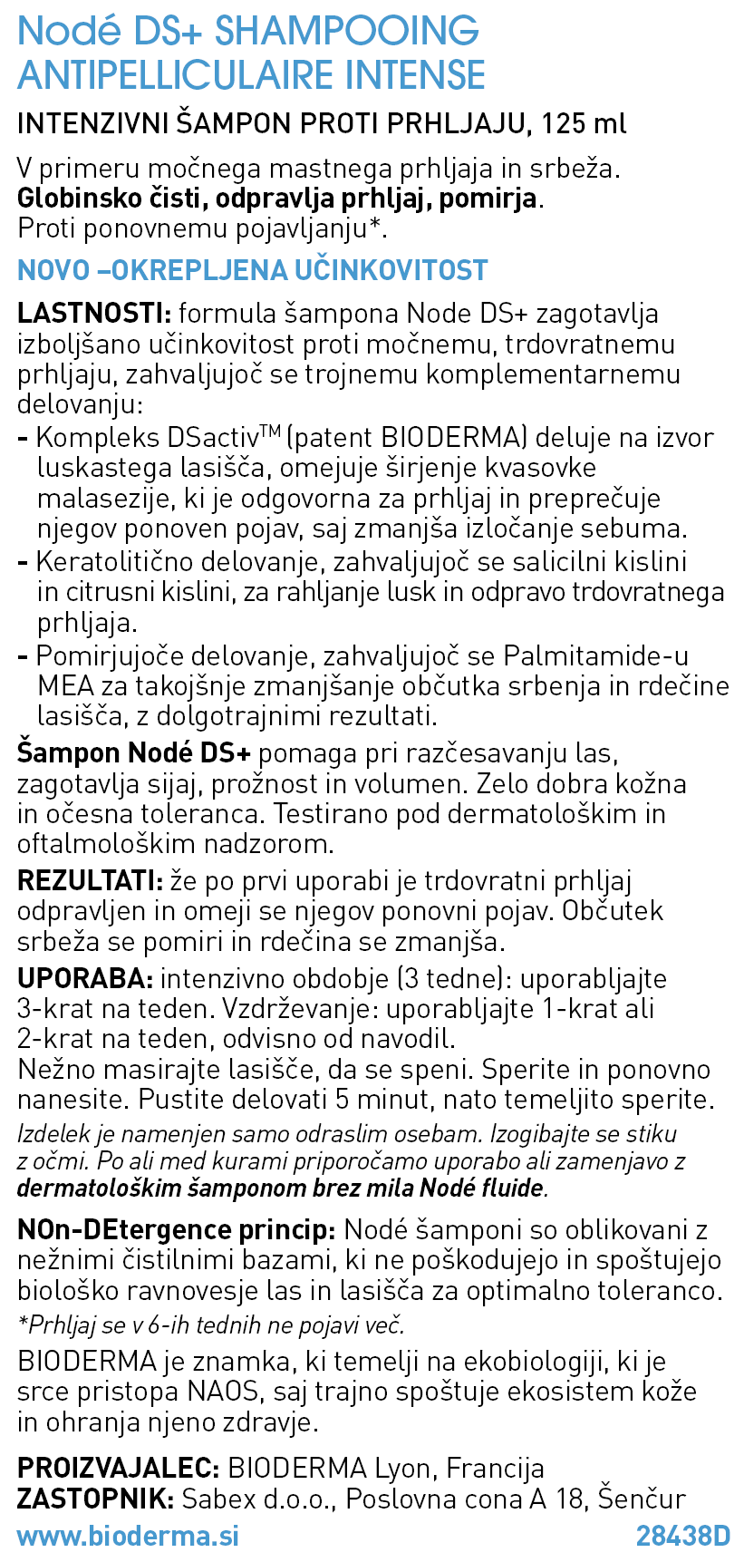 Bioderma Node DS+ šampon proti prhljaju je intenzivni dermatološki šampon, ki učinkovito bori proti močnemu prhljaju, preprečuje njegov ponovni pojav in pomirja srbenje ter nelagodje na lasišču. S pomočjo ekskluzivne Node DS+ formule in patentiranega kompleksa DSactive deluje na biološki vzrok nastanka prhljaja, kar zagotavlja trajno zmanjšanje prhljaja in takojšnjo pomiritev lasišča. Sveža in nežna dišava.