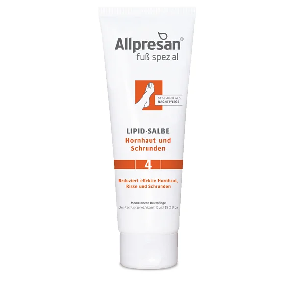Allpresan 4 lipidno mazilo je namenjeno negi stopal z zadebeljeno, trdo in poroženelelo kožo. Razvito je za vsakodnevno uporabo, saj učinkovito neguje in obnavlja kožno pregrado. Mazilo deluje ciljno proti površinskemu poroženevanju, razpokam in ragadam, obenem pa preprečuje njihovo ponovno nastajanje. S svojo edinstveno formulo, ki vključuje visoko koncentracijo 15 % uree, svetlinovo olje in vitamin E, je posebno prilagojeno potrebam suhe in poškodovane kože stopal. Redna uporaba pripomore k obnovi naravne mehkobe in elastičnosti kože.