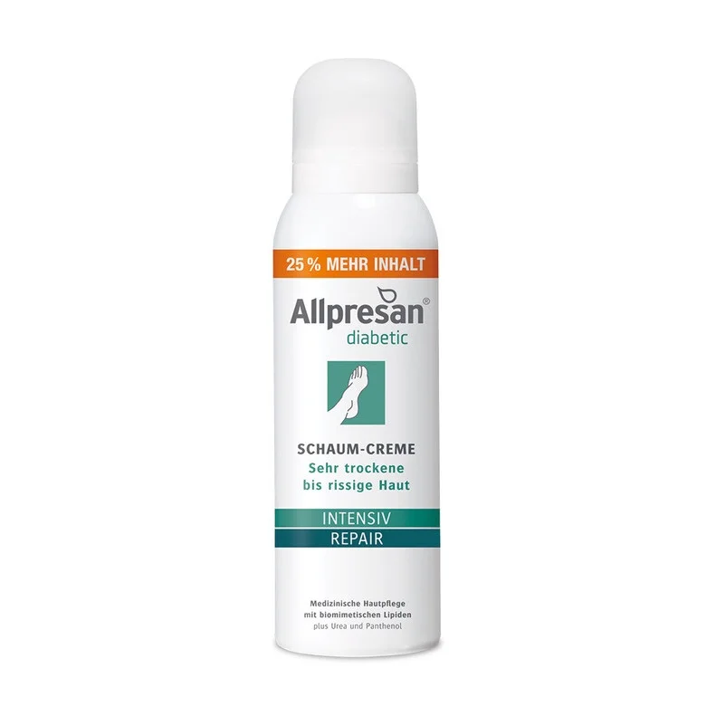 Allpresan Diabetic intensiv repair kremna pena z ureo je specializirana kremna pena za vsakodnevno nego zelo suhe in razpokane kože stopal in nog bolnikov s sladkorno boleznijo. Razvita je posebej za potrebe diabetične kože, ki je pogosto oslabljena in nagnjena k izraziti suhosti.