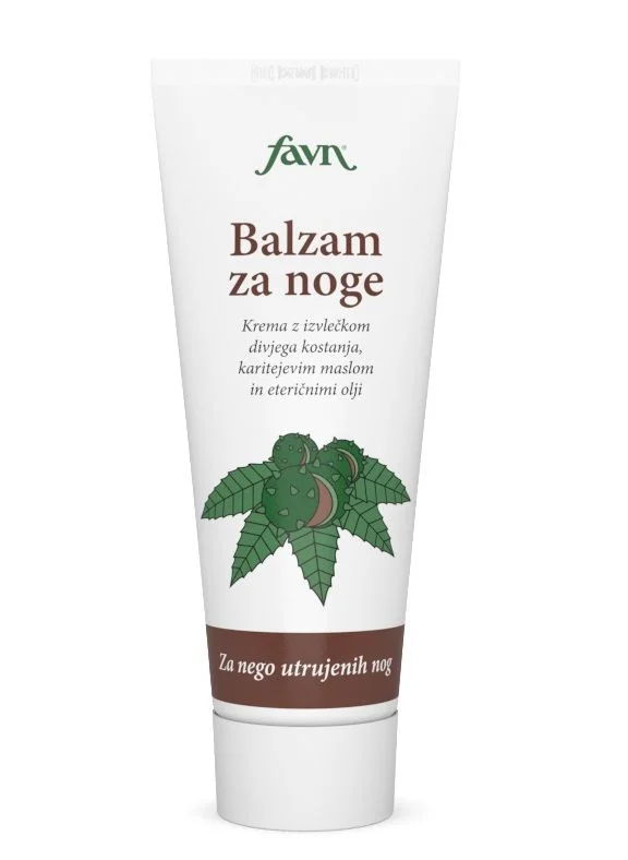 Favn Balzam za noge z divjim kostanjem neguje kožo prizadeto s krčnimi žilami, preprečuje otekanje in hladi utrujene noge. Primeren je za preventivno nego, nego ob že nastalih krčnih žilah ter kot dopolnilna nega pri kompresijskem zdravljenju. Vsebuje karitejevo maslo in rastlinske izvlečke, ki podpirajo cirkulacijo in vračajo prožnost koži.