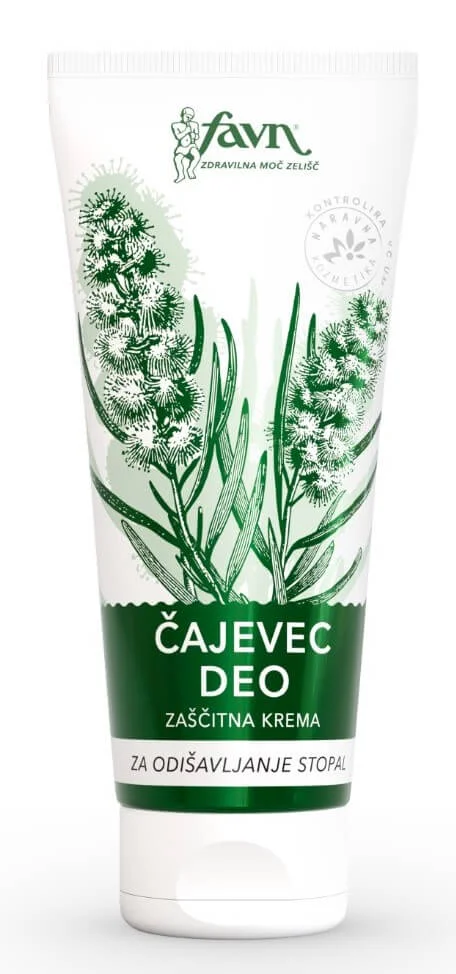 Favn Čajevec Deo zaščitna krema je negovalna krema, namenjena lajšanju težav s kožo na stopalih in na manjših predelih telesa. Njena formula se hitro vpije, preprečuje rast mikrobov in rahlo ohladi stopala. Izdelek je certificiran kot Naravna kozmetika IKC UM Maribor.