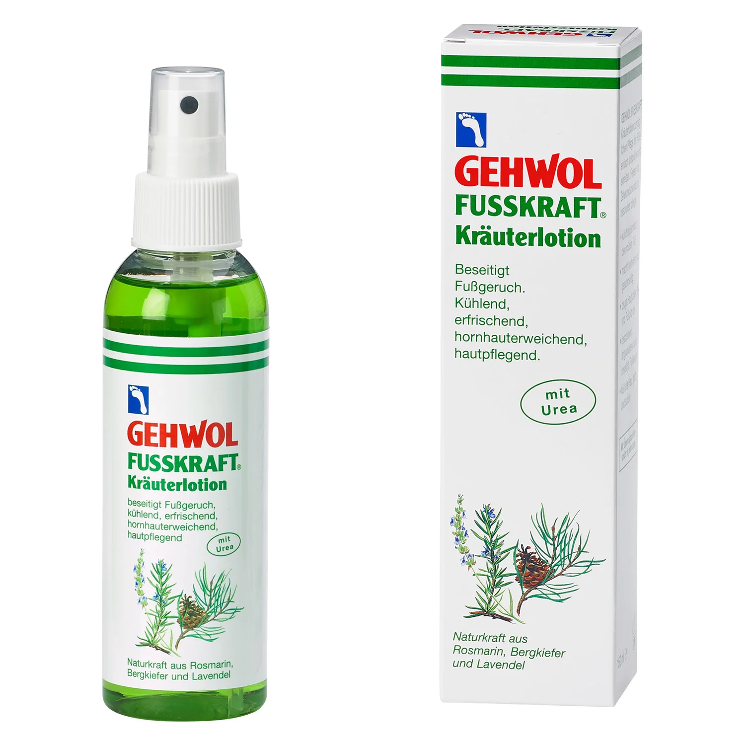 Gehwol Fusskraft zeliščni losjon vsebuje eterična olja sivke, rožmarina in gorskega bora, ki preprečujejo nastanek neprijetnega vonja in dezodorirajo stopala. Hkrati mehčajo prekomerno poroženelo kožo, zaradi česar je koža po uporabi bolj mehka in gladka.