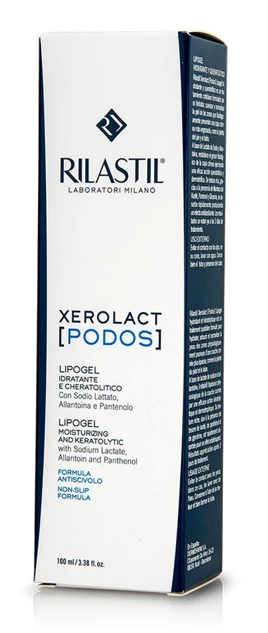 Rilastil Xerolact Podos lipogel za stopala je posebna nega, zasnovana za vlaženje, mehčanje in normalizacijo zadebeljenih predelov kože na stopalih, kot so podplati in pete, ki so pogosto suhi, trdi ali razpokani. Formulacija vsebuje natrijev laktat in alantoin, ki skupaj uravnavata debelino poroženele plasti kože in pripomoreta k obnovi zdrave teksture kože.