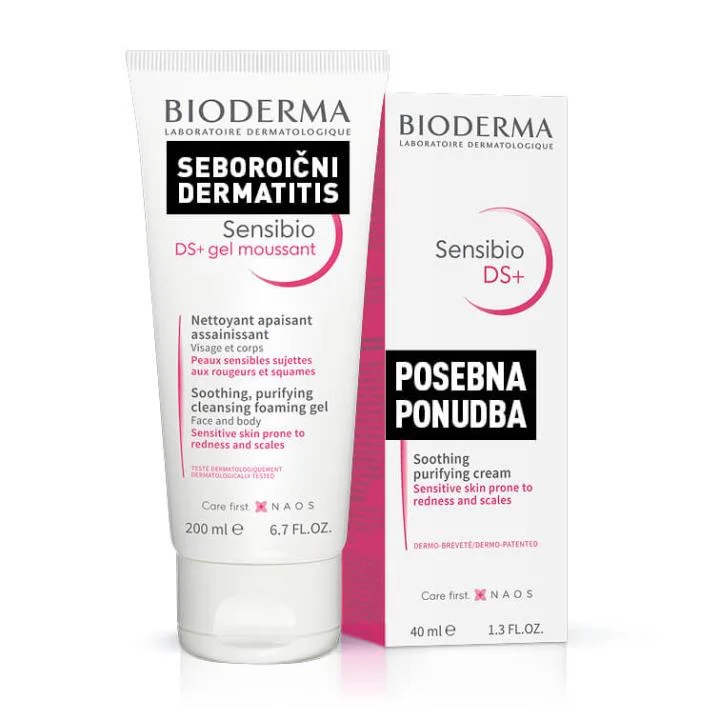 Bioderma Sensibio DS+ pomirjujoča krema je posebej zasnovana za nego občutljive kože, ki je nagnjena k seboroičnemu dermatitisu, rdečici in luskam. Krema neposredno zavira rast kvasovke Malassezia, ki pogosto poslabša te težave. Po nanosu je koža pomirjena in bolj enotnega videza. Lahka gelno-kremna formula nežno zmanjšuje rdečico in odstranjuje luske na nosnicah, obrveh, čelu in bradi. Izdelek je brez dišav, hipoalergen in ne maši por.