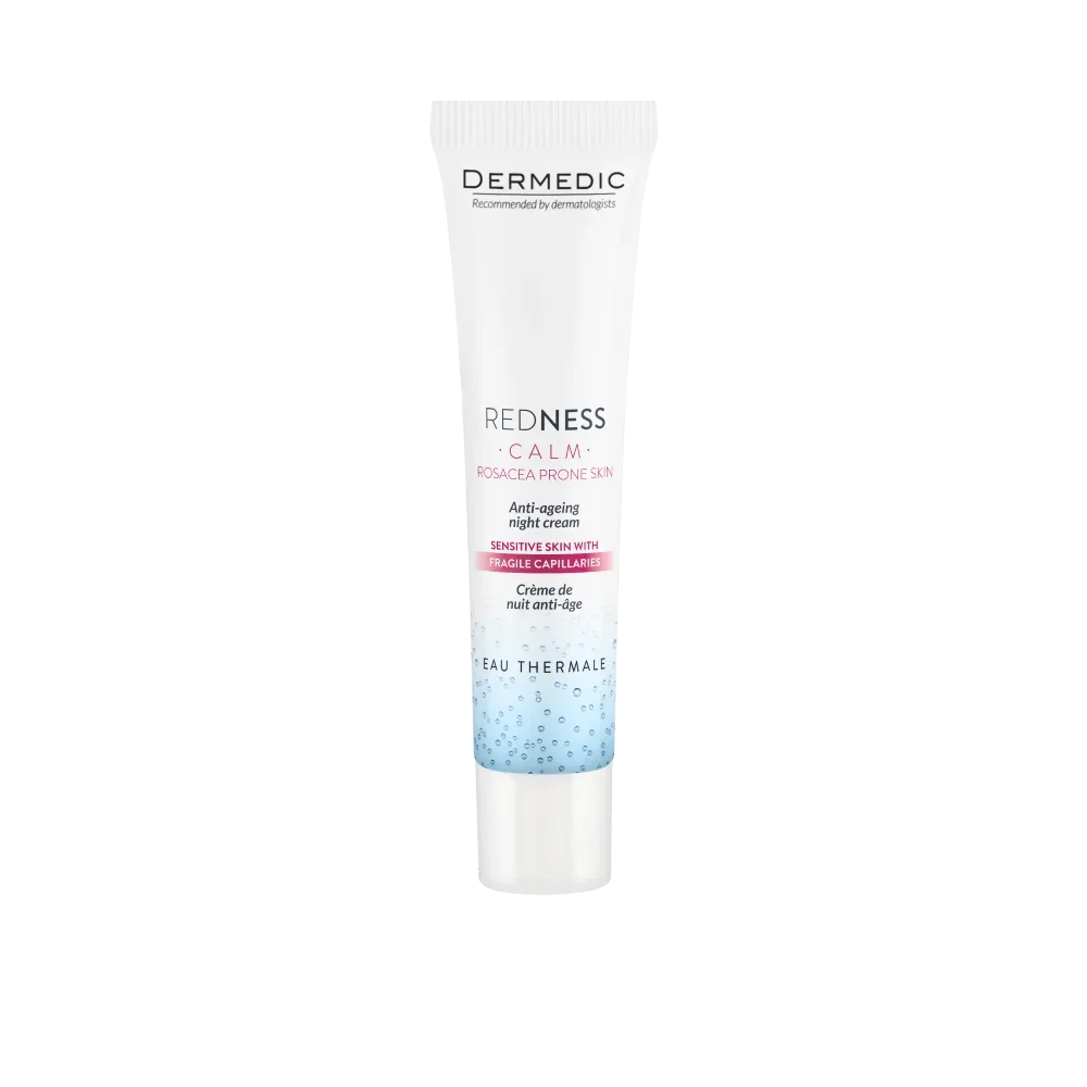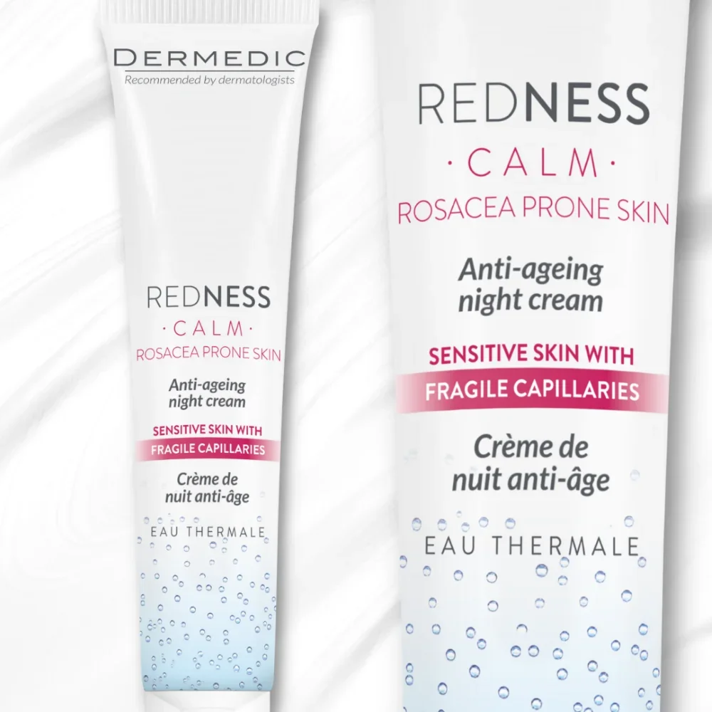 Dermedic, redness nočna krema proti staranju je posebej zasnovana za občutljivo kožo, nagnjeno k kuperozi. Globinsko nahrani, regenerira in neguje kožo ponoči, ko so procesi obnavljanja epidermalnih celic najintenzivnejši. Priporočena je tudi v začetnih fazah rozacee, saj pomaga krepiti kožo in zmanjševati vidne znake staranja.