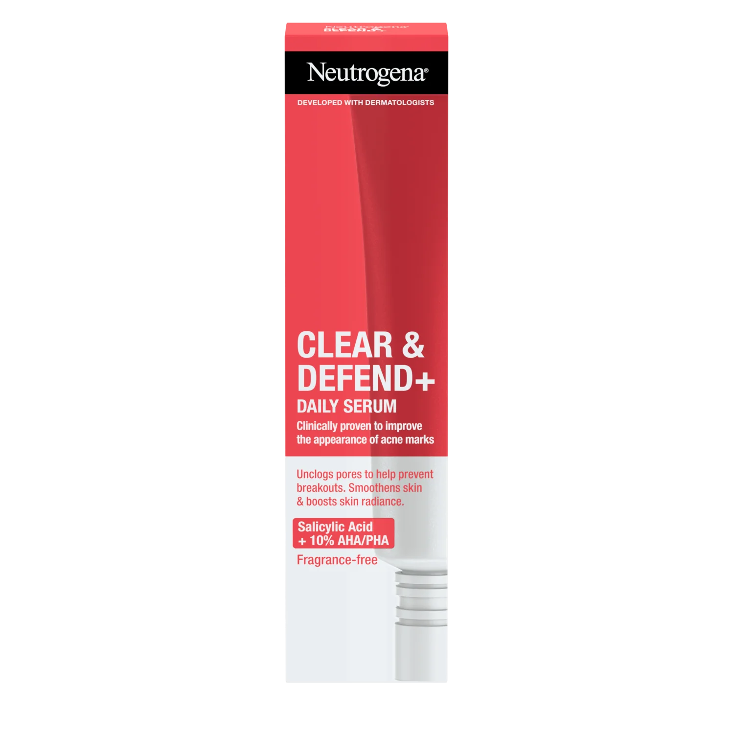 Neutrogena Clear & Defend+ je klinično dokazan dnevni serum, razvit v sodelovanju z dermatologi, ki združuje učinkovito kombinacijo AHA, BHA in PHA kislin. Namenjen je negi kože, nagnjene k aknam, ter izboljšanju njene teksture in videza. Ne vsebuje dišav, olj in je nekomedogen.