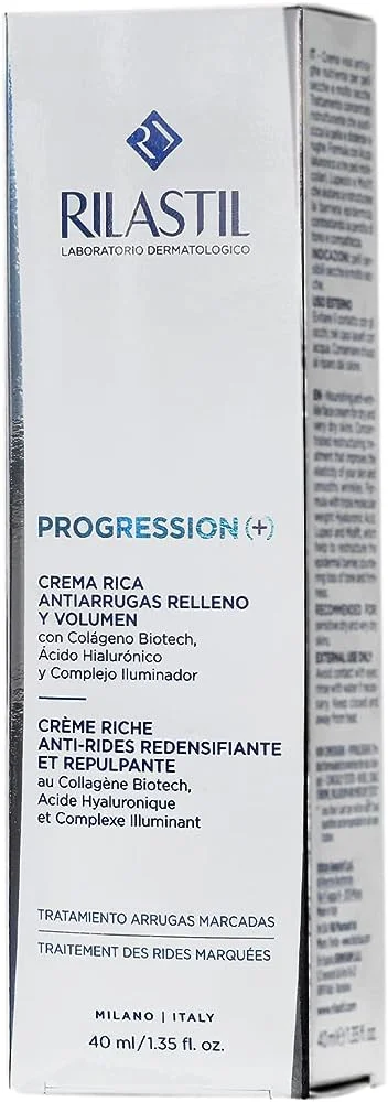 Rilastil Progression (+) hranilna krema je intenzivna, hitro vpojna krema, zasnovana za nego suhe do zelo suhe kože, ki cilja na znake staranja, kot so suhost, izguba elastičnosti, čvrstosti ter pigmentne nepravilnosti. Poudarja izboljšanje videza gub in izboljšanje naravne teksture kože. Formulacija združuje sestavine za globinsko vlaženje, kot sta hialuronska kislina in ceramidi, ter niacinamid, ki krepi in ščiti kožno bariero.
