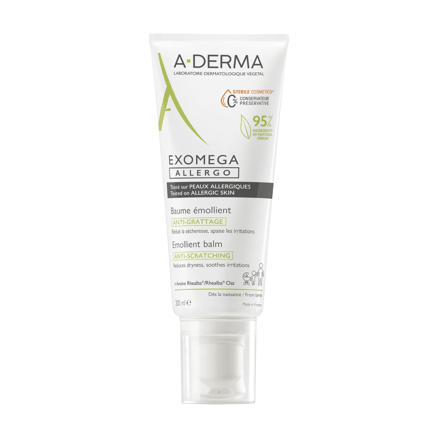 A-Derma Exomega Allergo emolientni balzam je namenjen negi suhe kože, nagnjene k atopijskemu dermatitisu, alergijam in ekcemom, ter za osebe z izraženimi kožnimi reakcijami zaradi težav, kot so astma ali alergije na hrano. Primeren je za uporabo na obrazu, telesu in očesnih vekah. Nudi trojni učinek: pomirja praskanje, draženje in rdečico, ter dolgotrajno obnavlja kožno bariero. Balzam ima bogato teksturo, ki se enostavno nanese na kožo in se hitro vpije.