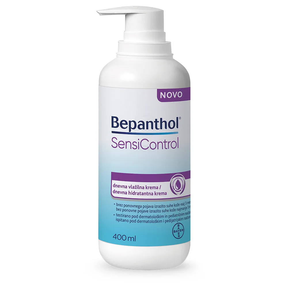 Bepanthol SensiControl je specializirana vlažilna krema, zasnovana za nego suhe in občutljive kože, še posebej primerna za kožo z atopičnemu dermatitisom. Izdelek se ponaša z edinstveno formulo "Derma-Defense", ki pomaga zaščititi kožo in ohranja njeno zdravje z močnim poudarkom na obnovi kožne pregrade. Primerna je za vsakodnevno uporabo pri celotni družini, vključno z dojenčki, in je posebej priporočljiva za ljudi, ki se spopadajo z izsušeno kožo ali kožo nagnjeno k ekcemom. Vsebuje prebiotike, ki pozitivno vplivajo na mikrobiom kože in pripomorejo k ohranjanju ravnovesja v koži. Poleg tega je obogatena z naravnimi olji, vitaminom B3 (niacinamid) in provitaminom B5 (pantenol), ki pomagajo krepiti naravno kožno pregrado ter zagotavljajo globoko vlaženje. Krema je zasnovana tako, da kožo pomirja in ščiti pred zunanjimi vplivi, obenem pa spodbuja obnovo poškodovanih kožnih plasti.