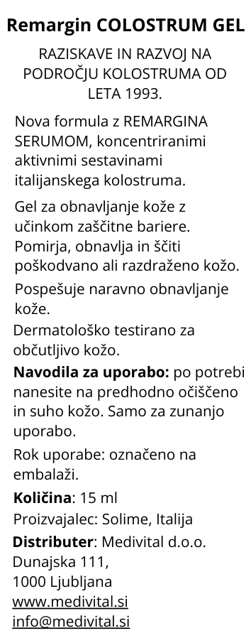 Remargin Colostrum gel je dermatološko preizkušen gel za obnovo kože z zaščitnim učinkom, izdelan iz naravnih sestavin (kolostrum, hialuronska kislina, aloe vera, eterična olja). Namenjen je za dermo kozmetično nego majhnih območij, ki so še posebej občutljiva, krhka, razdražena ali poškodovana.Gel je sestavljen iz 96 % naravnih sestavin, brez kortikosteroidov in silikonov, njegova učinkovitost pa je potrjena s kliničnimi testi, ki so pokazali hitro zmanjšanje rdečice in izboljšanje stanja kože.
