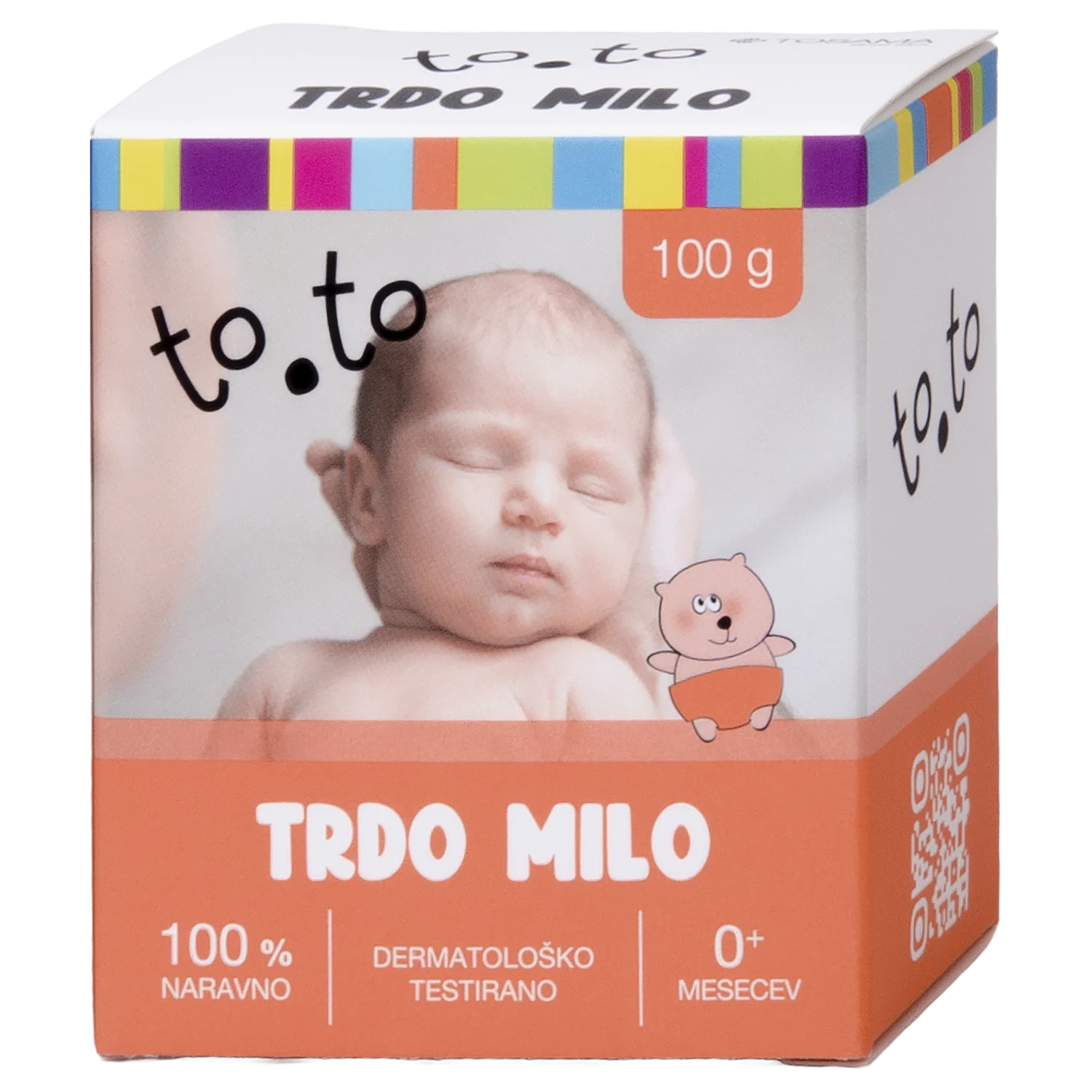 To.to baby je popolnoma naravno trdo milo, izdelano po tradicionalnem postopku in namenjeno nežni, občutljivi koži dojenčkov in malčkov. Vsebuje le izbrane rastlinske sestavine – bio-kokosovo, mandljevo in olivno olje, bio-kakavovo in palmovo maslo ter sivkino eterično olje, brez parfumov, konzervansov ali dražilnih dodatkov. Milo kožo nežno očisti, vlaži, nahrani in zaščiti, ne da bi jo izsušilo ali razdražilo.