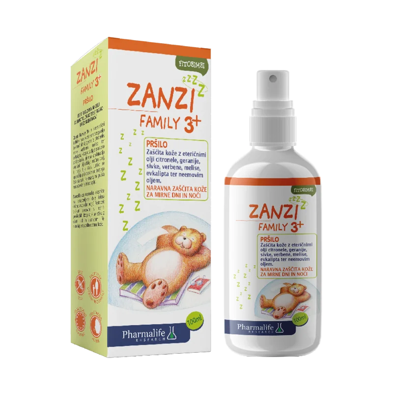 Fitobimbi Zanzi Family 3+ pršilo je naravni repelent s prijetnim vonjem, ki zagotavlja učinkovito zaščito pred piki žuželk in hkrati neguje kožo. Dermatološko testirana formula se hitro vpije, ne pušča mastnega občutka ali madežev. Izdelek je primeren za uporabo pri otrocih od 3. leta naprej in odraslih.