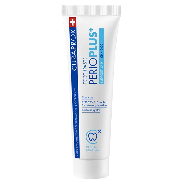 Curaprox Perio Plus+ Support je zobna pasta za intenzivno nego dlesni, posebej primerna pri vnetjih, po zobozdravstvenih posegih ali pri parodontalnih težavah. Vsebuje aktivno učinkovino klorheksidin diglukonat (0,09 %) in naravne sestavine, ki pomagajo pri celjenju in zaščiti ustne votline.