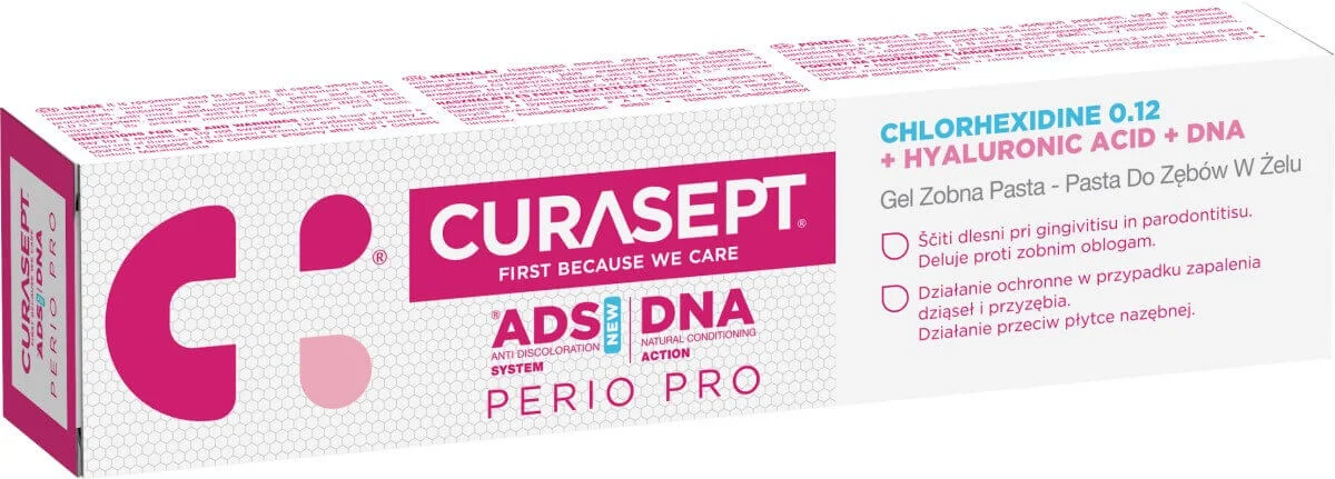 Curasept ADS DNA Perio Pro zobna pasta pomaga obvladovati nastajanje zobnih oblog, celiti prizadeto tkivo in obnavljati dlesni kot podpora pri terapiji parodontitisa, postooperativnem celjenju in po vstavitvi implantatov. Priporočena je za kratkotrajno uporabo do 4 mesece po navodilu stomatologa ali ortodonta. Brez alkohola za zaščito ustne sluznice pred izsušitvijo in brez penila SLS, ki bi zmanjšalo delovanje klorheksidina.