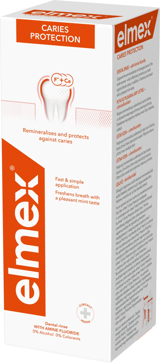 Elmex ustna voda proti kariesu je namenjena dodatni zaščiti zob poleg vsakodnevnega ščetkanja. Njena formula ima prijeten okus mete in pomaga preprečevati razvoj kariesa ter ohranja zobe močne in zdrave. Ne vsebuje alkohola in barvil. Primerna je za odrasle in otroke, starejše od 6 let ter tudi za osebe z zobnim aparatom ali protezo. Poleg tega je priročna tudi za uporabo na potovanjih.