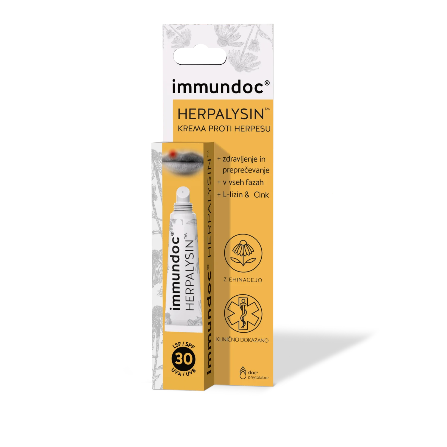 Immundoc Herpalysin krema deluje direktno na vzrok herpesa, ki je posledica virusne okužbe, in pomaga krepiti imunski sistem. Sestavine, kot so L-lizin, cink in ameriški slamnik (ehinaceja), aktivno podpirajo naravno regeneracijo kože in preprečujejo širjenje okužbe. L-lizin, esencialna aminokislina, preprečuje razmnoževanje virusa herpes simplex, medtem ko cink pospešuje celjenje ran in lajša simptome, kot so bolečina in pekoč občutek. Ehinaceja pa je rastlina, znana po svojih protivirusnih lastnostih, ki dodatno podpira imunski sistem in pospeši regeneracijo kože. SPF 30 ščiti prizadeta področja kože pred sončnimi žarki, ki lahko spodbujajo razvoj virusa.