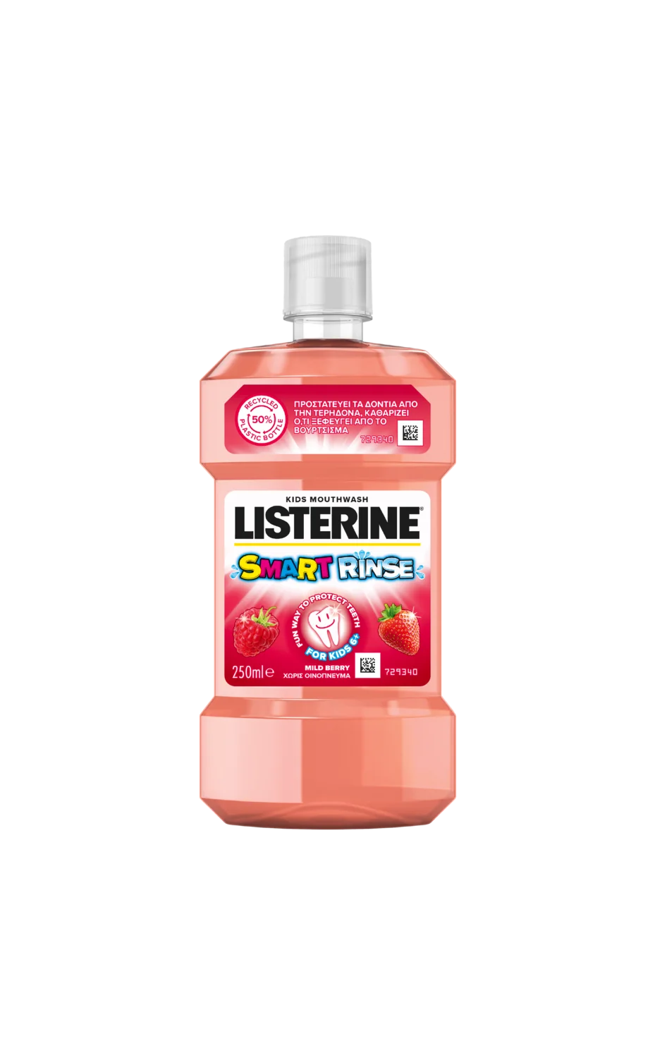 Listerine Smart Rinse Kids Mild Berry je ustna voda za otroke od 6. leta dalje, ki pomaga pri zaščiti zob in dlesni. Zasnovana je tako, da doseže tudi skrite kotičke ustne votline, kamor zobna ščetka ne seže.