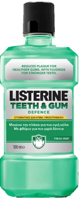 Listerine Teeth & Gum Defence je ustna voda, oblikovana za krepitev zobne sklenine in zaščito pred razpadanjem zob. Namenjena je vsakodnevni ustni higieni ter pomaga preprečevati in zmanjševati zobne obloge. Deluje tudi na področju dlesni, jih krepi ter prispeva k njihovemu boljšemu stanju. S svojo formulo doseže tudi težko dostopne predele ustne votline in zagotavlja učinkovito vsakodnevno zaščito zdravih zob in dlesni.