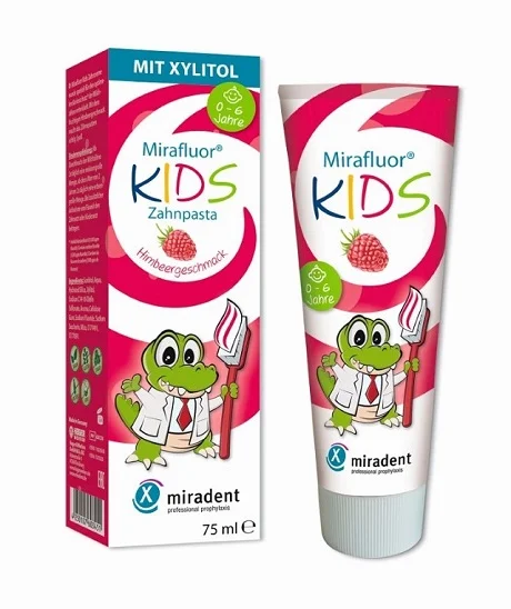 Miradent Mirafluor Kids je zobna pasta, razvita posebej za zaščito mlečnih zob in zgodnjo nego stalnih zob pri otrocih. Primerna je za vsakodnevno uporabo pri otrocih od 0 do 6 let starosti ter spodbuja redno ščetkanje s sadnim okusom maline. Zaradi skrbno zasnovane sestave je primerna tudi za otroke z občutljivo ustno sluznico, saj ne vsebuje SLS. Vsebuje natrijev fluorid 1000 ppm.