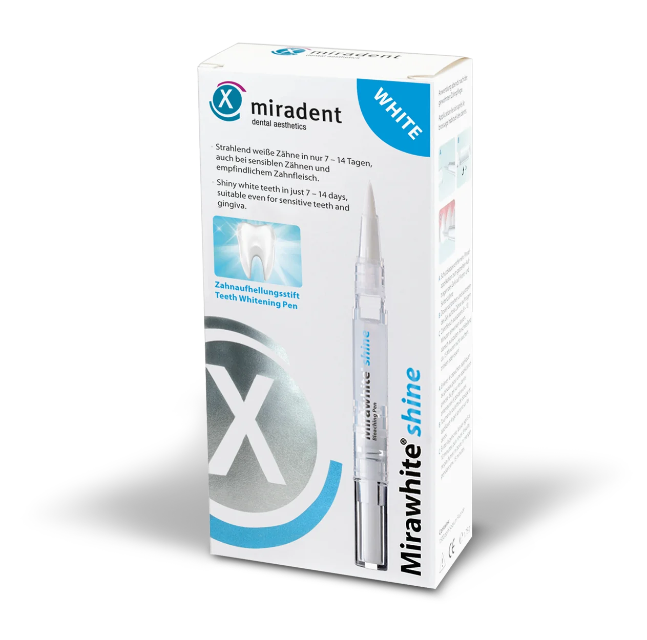 Miradent Mirawhite Shine deluje na osnovi Ardox-X tehnologije, ki temelji na procesu oksidacije brez nastajanja prostih radikalov. Aktivne kisikove molekule v gelu raztapljajo in odstranjujejo madeže na površini zob, ki nastanejo zaradi kave, čaja, vina ali nikotina. Metoda je neabrazivna, gel je topen v vodi in slini ter ne poškoduje zobne sklenine, sluznice ali zalivk. Z redno uporabo zobem postopoma povrne naravno belino in sijaj, brez draženja ali povečane občutljivosti.