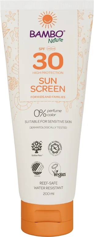 Bambo Nature Sunscreen losjon ZF30 je nežen in učinkovit zaščitni losjon, ki ščiti pred škodljivimi UVA in UVB žarki, vpija 96 % UV žarkov in je fotostabilen. Formula brez dišav in barvil je primerna za vse tipe kože, vključno z občutljivo, ter zagotavlja visoko zaščito in svilnato mehko kožo. Je dermatološko testiran, vodoodporen in ne škoduje morskem življenju.