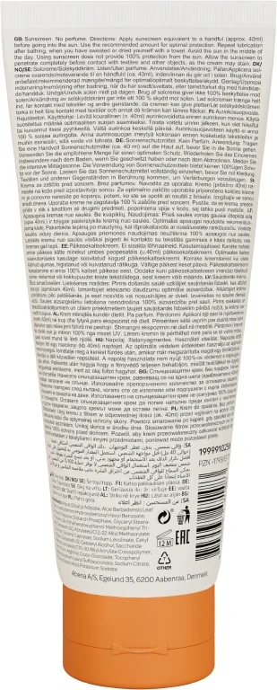 Kremo nanesite (približno 40 ml) 20 minut pred izpostavitvijo soncu. Za optimalno zaščito ponovno nanesite po kopanju, potenju ali brisanju z brisačo. Izogibajte se soncu sredi dneva. Uporaba kreme ne zagotavlja 100 % zaščite pred soncem. Pred stikom s tekstilom ali drugimi predmeti pustite, da se krema popolnoma vpije, saj lahko povzroči madeže.