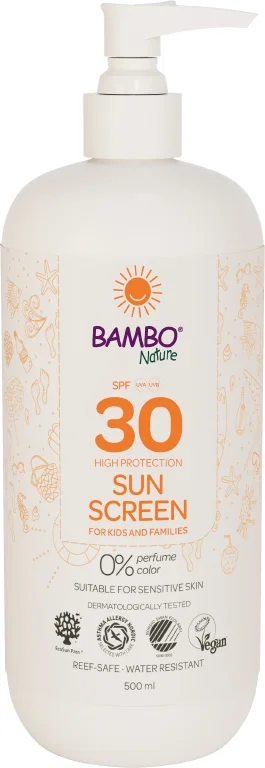 Bambo Nature Sunscreen losjon ZF30 je nežen in učinkovit zaščitni losjon, ki ščiti pred škodljivimi UVA in UVB žarki, vpija 96 % UV žarkov in je fotostabilen. Formula brez dišav in barvil je primerna za vse tipe kože, vključno z občutljivo, ter zagotavlja visoko zaščito in svilnato mehko kožo. Je dermatološko testiran, vodoodporen in ne škoduje morskem življenju.