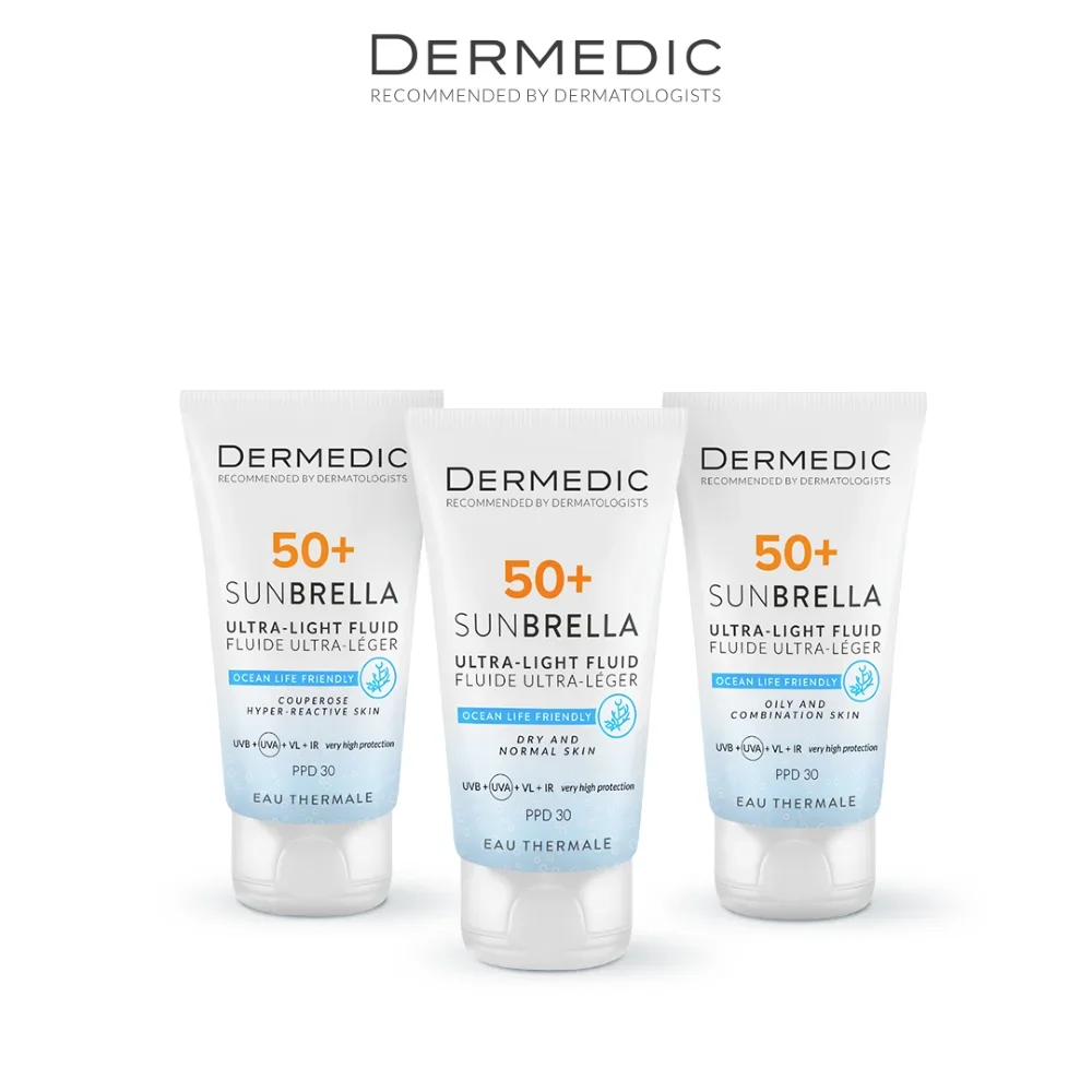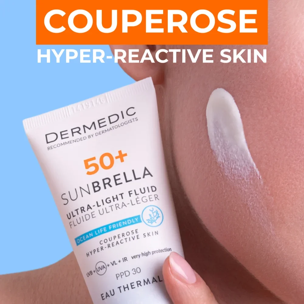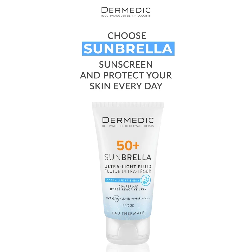 Dermedic Sunbrella izjemno lahek fluid je zaščitna nega za obraz, posebej razvita za potrebe hiperaktivne in kuperozne kože. Ščiti pred sončnimi žarki, hkrati intenzivno vlaži in pomirja. Njegova lahka formula na vodni osnovi se hitro vpije, ne bremeni kože ter ne pušča belega filma.