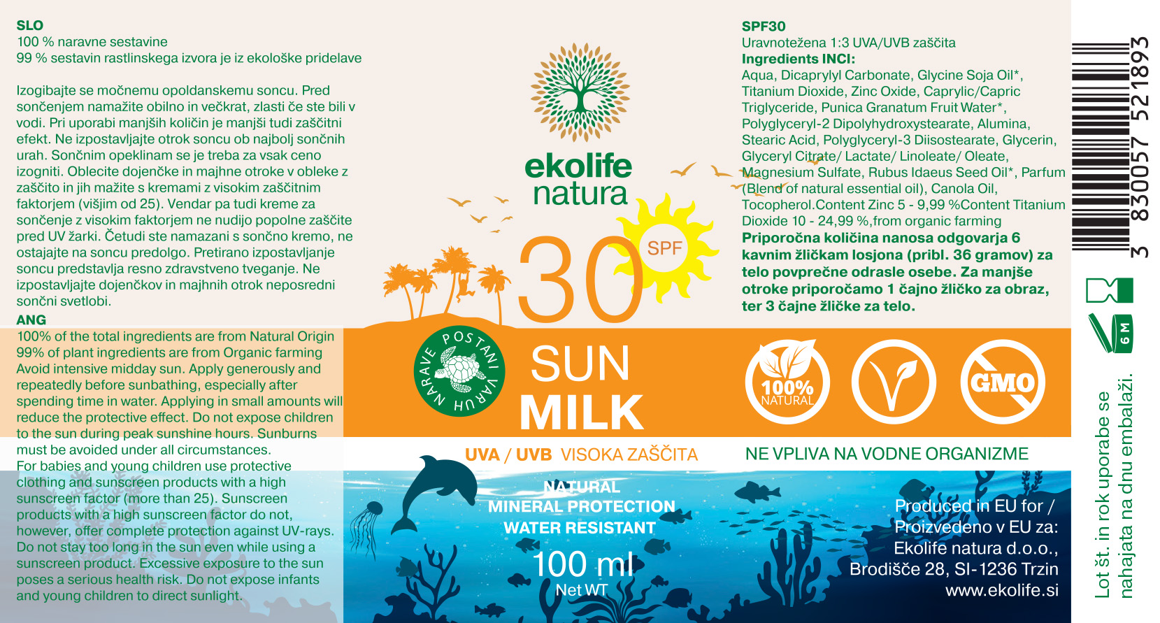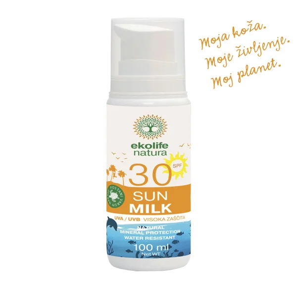 EKOLIFE NATURA mleko za zaščito pred soncem z zaščitnim faktorjem 30 nudi visoko in zanesljivo zaščito pred soncem za vse tipe kože, tudi za zelo občutljivo. Njegova lahka, nežna tekstura omogoča enostaven nanos brez belih sledi ter je primerna za uporabo na obrazu in telesu. Izdelek je 100 % naravnega izvora, vodoodporen, okolju prijazen in primeren za vso družino. Je naravno mleko za zaščito pred soncem z mineralnimi filtri, ki kožo takoj po nanosu ščiti pred škodljivimi UVA in UVB žarki ter hkrati neguje kožo z izbranimi rastlinskimi olji in antioksidanti.