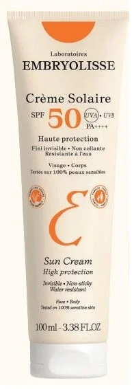 Embryolisse sončna krema SPF 50 je visoko učinkovita zaščita pred soncem za obraz in telo, primerna za vso družino od 3. leta dalje. Namenjena je vsakodnevni zaščiti kože pred škodljivimi vplivi sončnih žarkov ter je primerna za vse tipe kože, tudi za občutljivo. Ima lahko, nemastno in nelepljivo teksturo, ki se enostavno nanaša in ne pušča belih sledi. Krema je vodoodporna, dermatološko testirana, nekomedogena in primerna za vegane.