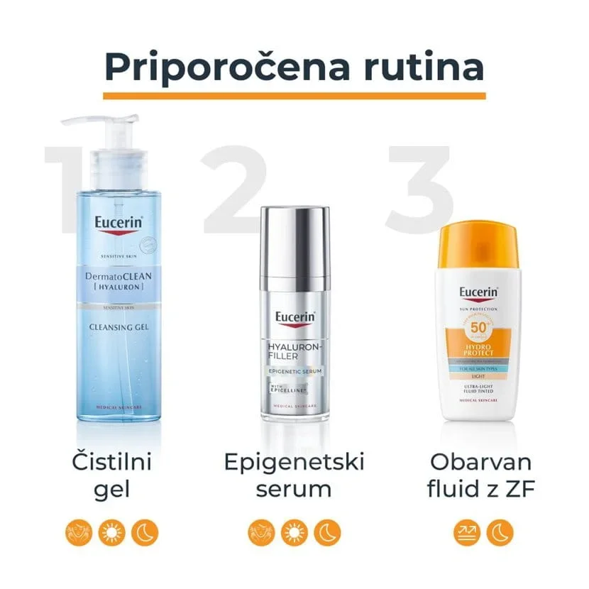 Eucerin Sun Hydro Protect Tinted obarvan fluid za zaščito obraza pred soncem ZF50+ je namenjen vsakodnevni zaščiti obraza in dekolteja pred soncem. Obarvan fluid ima lahko teksturo, ki se hitro vpije. Z AOX SHIELD tehnologijo nudi visoko UVA in UVB zaščito ter obrambo pred modro svetlobo, zato je primeren tudi za vse, ki so pogosto izpostavljeni zaslonom. Poleg tega kožo tudi vlaži in ji daje dolgotrajen občutek svežine. Barvni pigmenti v formuli poskrbijo za brezhibno ujemanje s poltjo in enakomeren ten kože. Primeren je za vse tipe kože, tudi za občutljivo, saj je hipoalergen. Na voljo je v odtenkih light in medium.