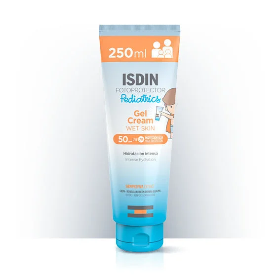 Isdin Pediatrics gel krema SPF 50 je zaščitna gel-krema za obraz in telo, namenjena celotni družini, predvsem pa dojenčkom ter otrokom od 6. meseca dalje. Primerna je za vse tipe kože, vključno z občutljivo in atopijsko, saj ne vsebuje dišav ali mineralnih olj, nanese se lahko tudi na mokro kožo ter je zelo odporna na vodo in trenje. Zagotavlja visoko zaščito pred UVA in UVB žarki, kožo intenzivno vlaži ter nudi osvežujoč, hitro vpojen nanos brez mastnega zaključka.