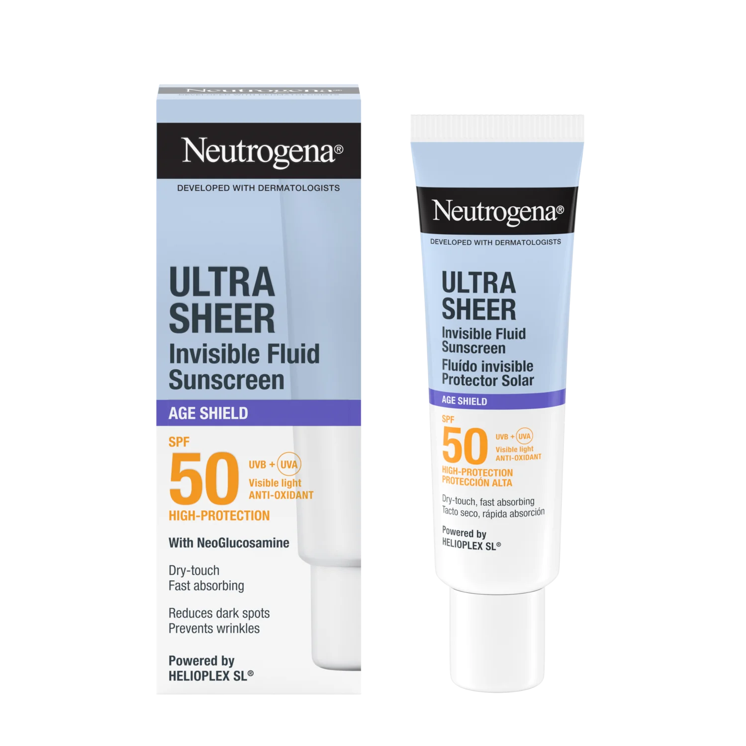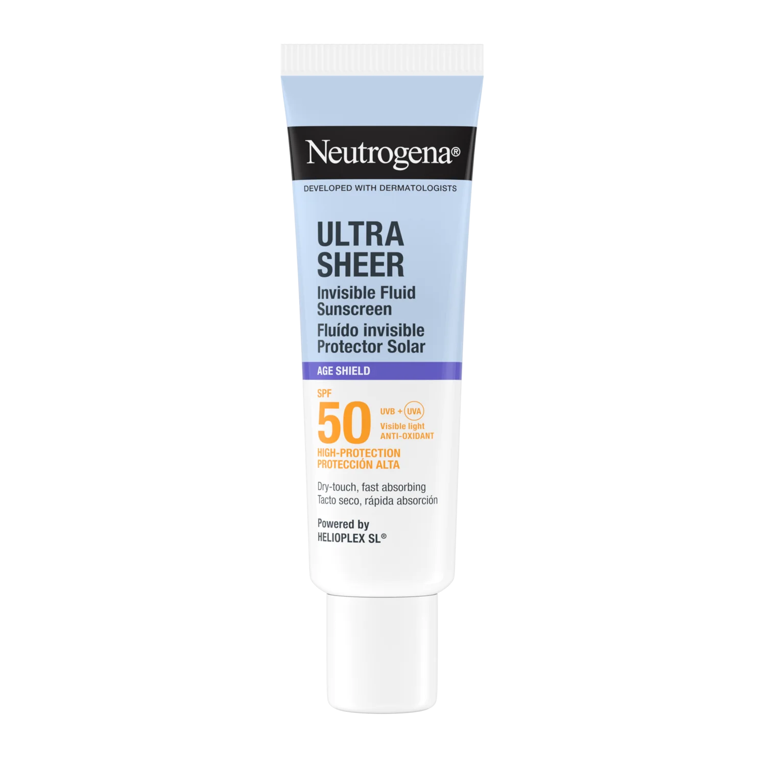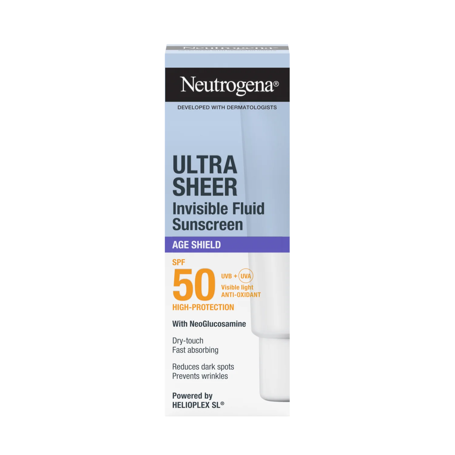 Izjemno lahka tekstura s suhim otipom se hitro vpije, zato je popolna kot podlaga za ličila, saj ne pušča belih sledi ali mastnega občutka. Izdelek je odporen na vodo in potenje, hipoalergen*, nekomedogen, brez dišav ter nežen do kože. Oftalmološko testiran in ne draži oči, zato je primeren za vsakodnevno uporabo. Neutrogena Ultra Sheer Invisible Fluid Age Shield SPF 50 ne le ščiti kožo pred škodljivimi sončnimi žarki, temveč tudi vidno zmanjšuje temne madeže in preprečuje nastanek gub, zaradi česar je koža videti bolj zdrava, gladka in sijoča. Napredna formula z nevidnim zaključkom prispeva k bolj enakomernemu in svetlejšemu tenu kože.