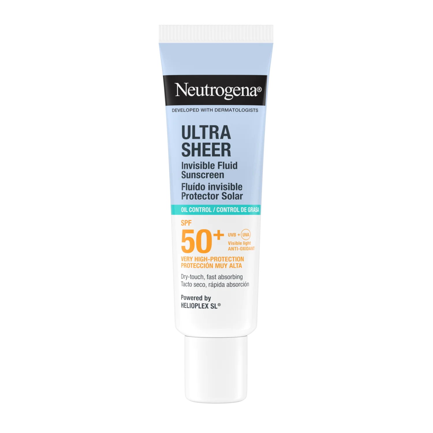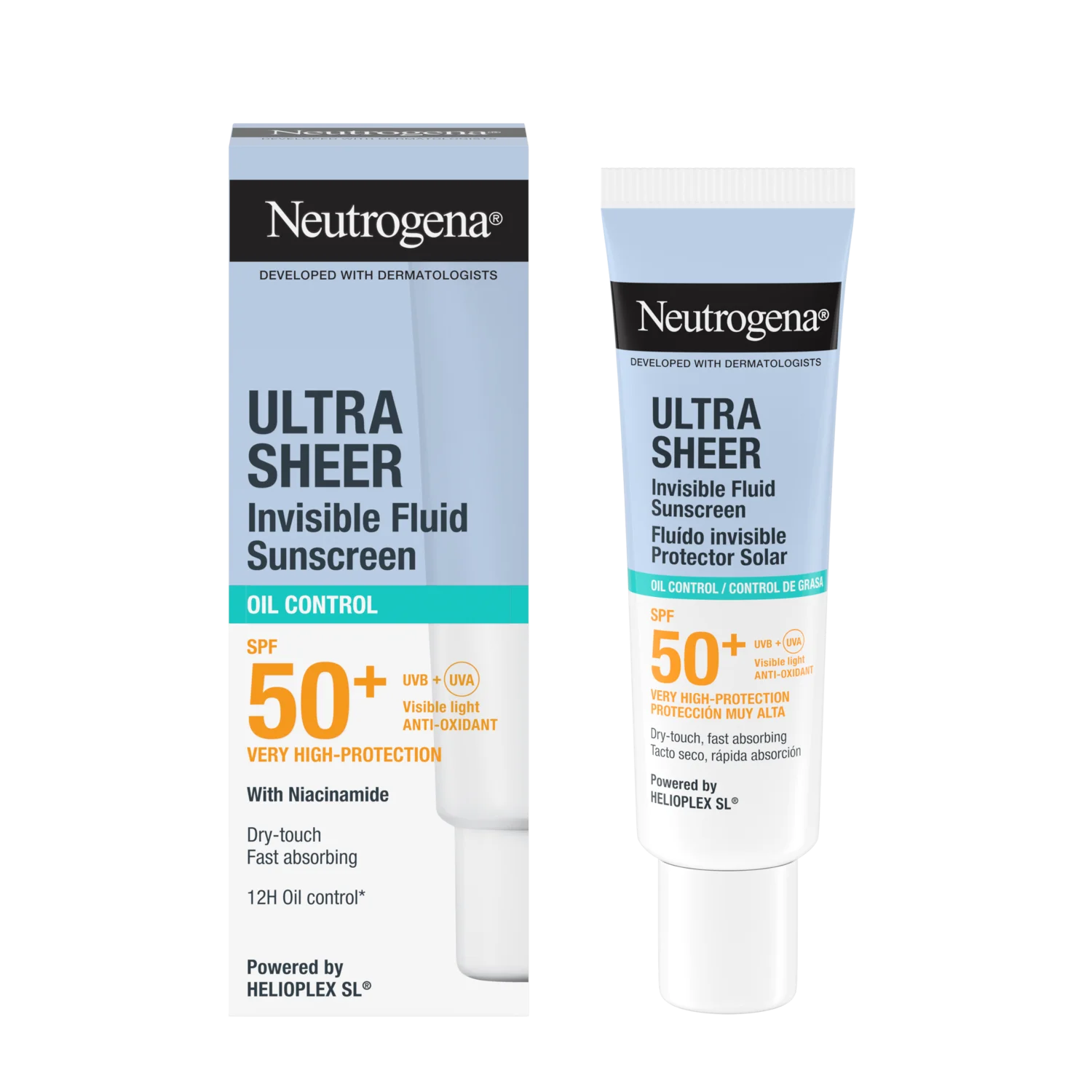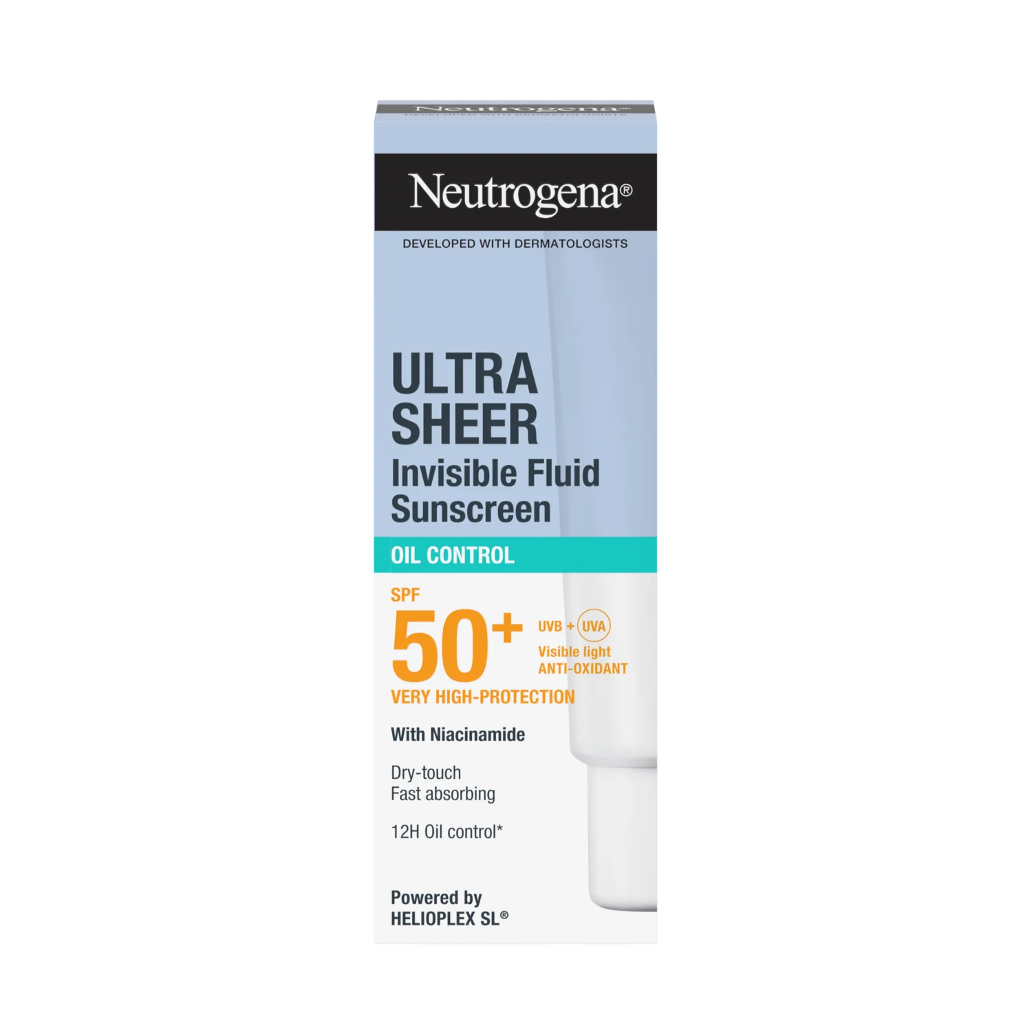 Neutrogena Ultra Sheer Invisible Fluid Oil Control SPF 50+ je dermatološko testiran zaščitni fluid z zelo visoko zaščito, zasnovan za normalno do mastno kožo, vključno z občutljivo kožo. S tehnologijo Helioplex SL zagotavlja zelo visoko širokospektralno zaščito pred UVB, UVA, dolgimi UVA žarki, vidno svetlobo in onesnaženjem.