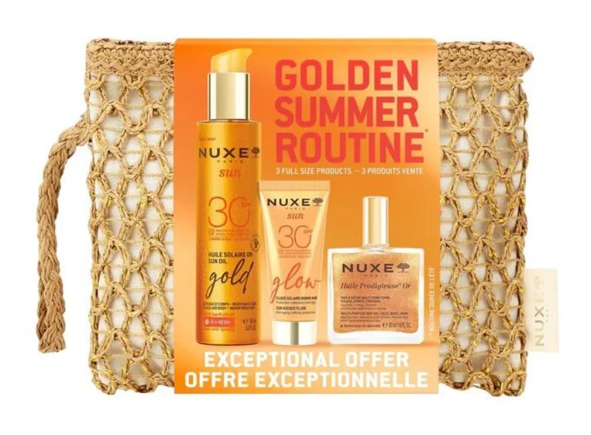 Nuxe Sun Set zlata poletna rutina je luksuzna poletna torbica z dvema izdelkoma za zaščito pred soncem in enim negovalnim oljem, zasnovana za sijočo, zaščiteno in polepšano kožo. Vključuje fluid za obraz SPF30, zlato sončno olje SPF30 za obraz in telo ter Huile Prodigieuse Or.