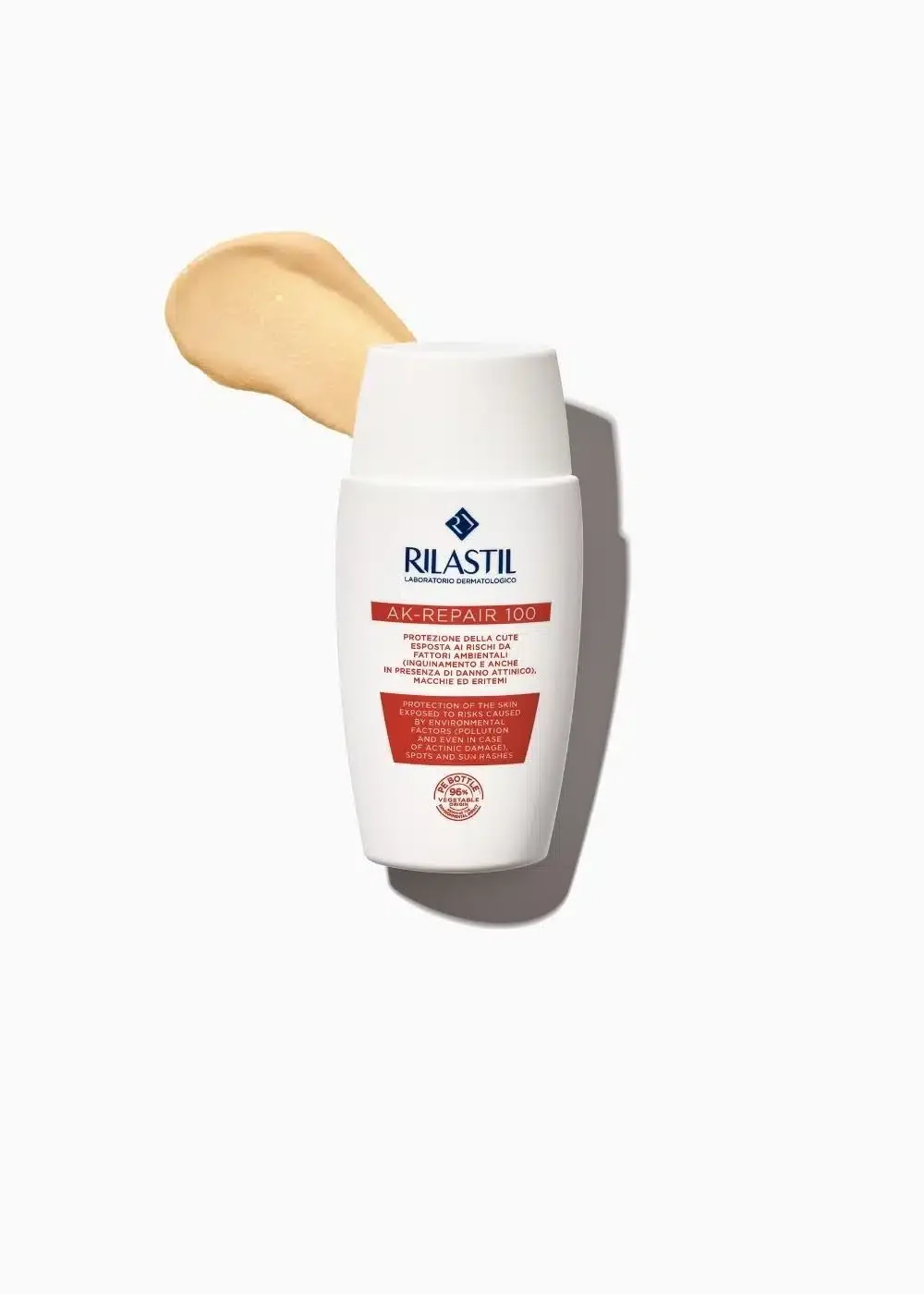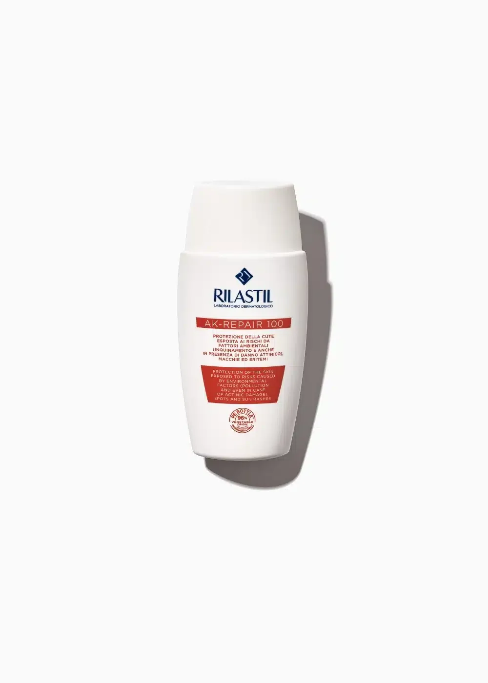 Rilastil AK 100-Repair tretma za aktinično keratozo je tekoča emulzija za zaščito in vlaženje občutljive kože, nagnjene k rdečici in pigmentnim madežem. Deluje antioksidativno in pomirjujoče, blaži rdečico, srbenje ter skelenje. Priporočljiva je tudi kot dopolnilna zaščita pri aktinični keratozi ter drugih začetnih in površinskih oblikah ne-melanomskega kožnega raka. Visoka zaščita UVA in UVB.