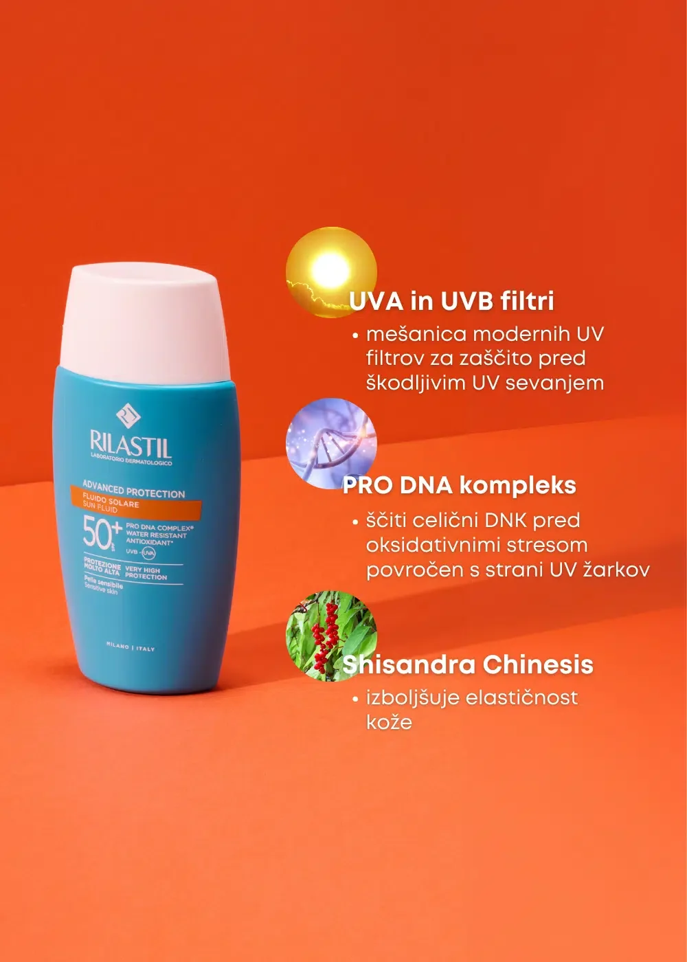 Rilastil Sun System Advanced Protection fluid ZF50+ je lahek zaščitni fluid z antioksidativnim delovanjem. Primeren za občutljivo, normalno in suho kožo, katero vlaži do 8 ur. Formula, ki vsebuje naravni emulgator in vodoodporni polimer ter ne vsebuje mikroplastike, je zasnovana tako, da zmanjšan vpliv za onesnaževanje vode. Izdelek ne pušča belih sledov in ne vsebuje alkohola. Klinično, dermatološko in oftalmološko testiran ter hipoalergen.