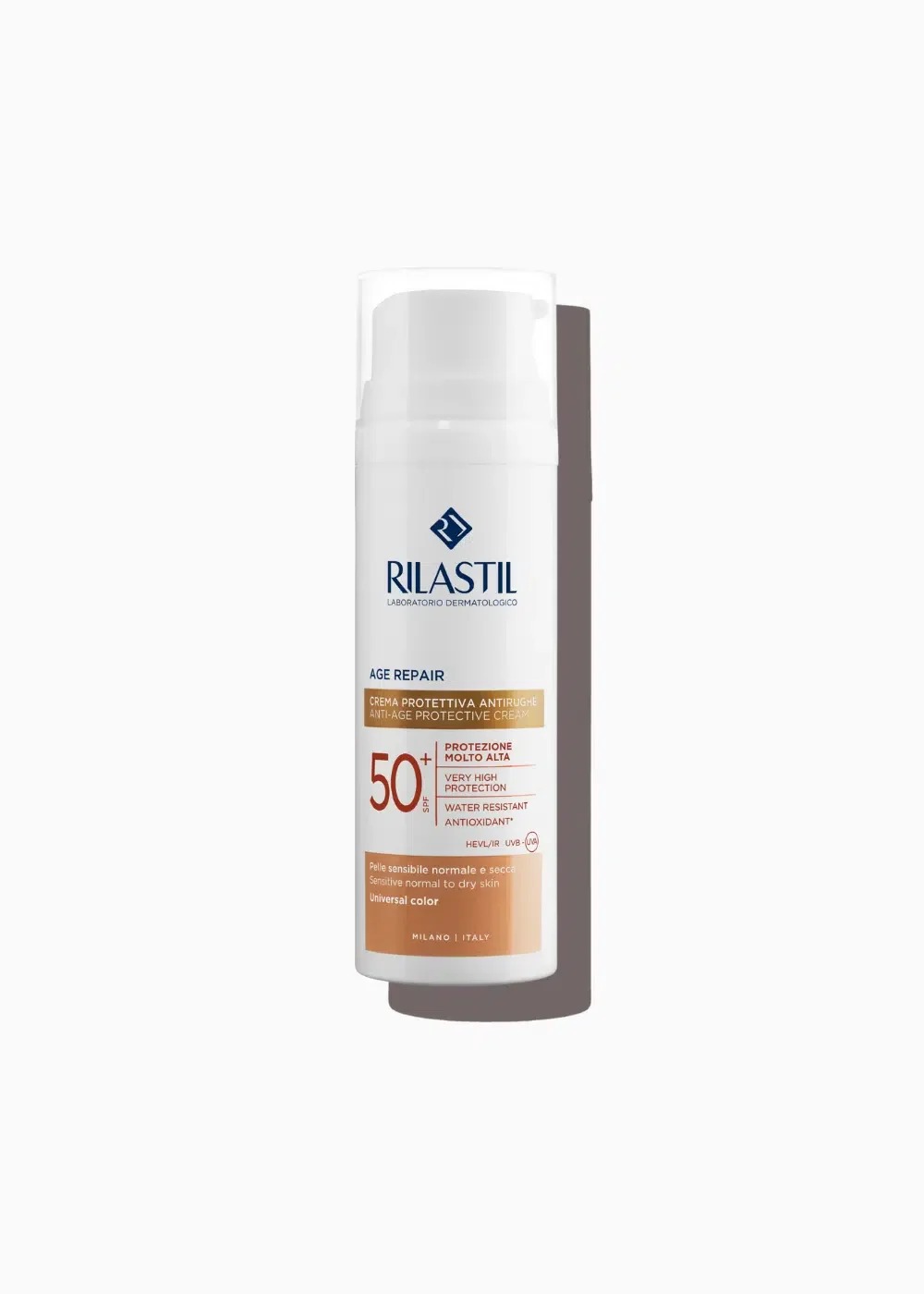Rilastil Sun System Age Repair obarvana krema ZF50+ je vodoodporna krema proti gubam z antioksidativnim učinkom. Univerzalnega odtenka, primerna za vse tipe kože, tudi občutljivo. Visok zaščitni faktor ščiti pred nastankom sončnih opeklin, pigmentnih madežev in sončnih izpuščajev. Vsebuje kompleks Age Repair, ki preprečuje in zmanjšuje znake fotostaranja. Kožo ščiti pred UVA/UVB žarki, modro svetlobo in infrardečim sevanjem. Ne pušča belih sledov in je primerna kot podlaga za ličenje. Formula je oftalmološko, dermatološko in klinično testirana ter ne vsebuje barvil, dišave in derivatov pšenice.