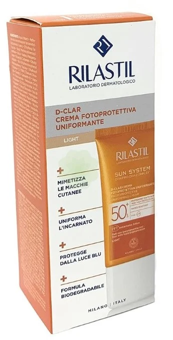 Rilastil D-Clar obarvana zaščitna krema SPF50+ je nežna fotozaščitna krema z žametno teksturo, posebej formulirana s kompleksom CLARI-TECH, ki pomaga zmanjševati nastanek temnih pigmentnih madežev (hiperpigmentacij). Tonirni odtenek zmanjša vidljivost hiperpigmentacij ter daje koži videz enakomerne polti. Krema nudi zelo visoko zaščito pred UVA in UVB sevanjem ter je primerna za normalno in suho kožo.