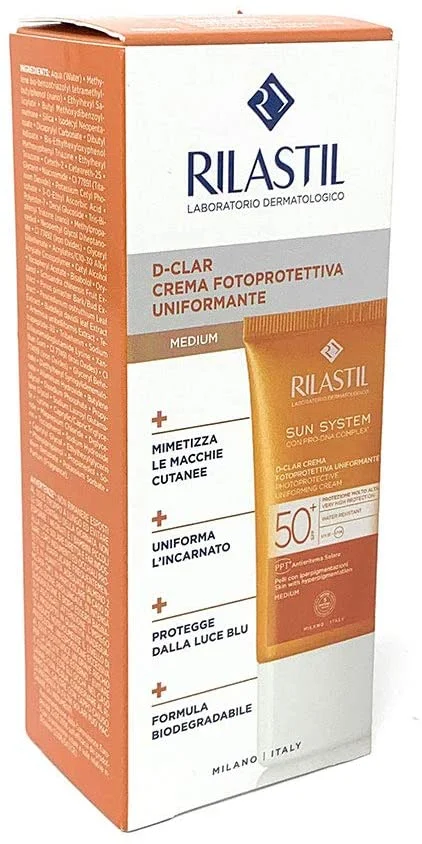 Rilastil D-Clar obarvana zaščitna krema SPF50+ je nežna fotozaščitna krema z žametno teksturo, posebej formulirana s kompleksom CLARI-TECH, ki pomaga zmanjševati nastanek temnih pigmentnih madežev (hiperpigmentacij). Tonirni odtenek zmanjša vidljivost hiperpigmentacij ter daje koži videz enakomerne polti. Krema nudi zelo visoko zaščito pred UVA in UVB sevanjem ter je primerna za normalno in suho kožo.