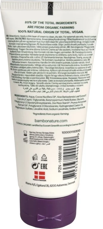 Bambo Nature otroška pomirjujoča krema je nežna nega za dojenčkovo kožo, ki jo ščiti, ohranja mehko in zdravo ter pomirja suho, razdraženo ali poškodovano kožo. Ustvari zaščitno pregrado, ki preprečuje prekomerno vlago in ohranja kožo navlaženo, zato je odlična za nego rdeče ritke, suhe ličke in občutljive kože. Krema je dermatološko testirana, ne vsebuje parfumov, barvil in sestavin živalskega izvora, temveč uporablja samo naravne rastlinske sestavine. Je veganska in skladna s certifikacijskimi standardi »Ecocert COSMOS«.