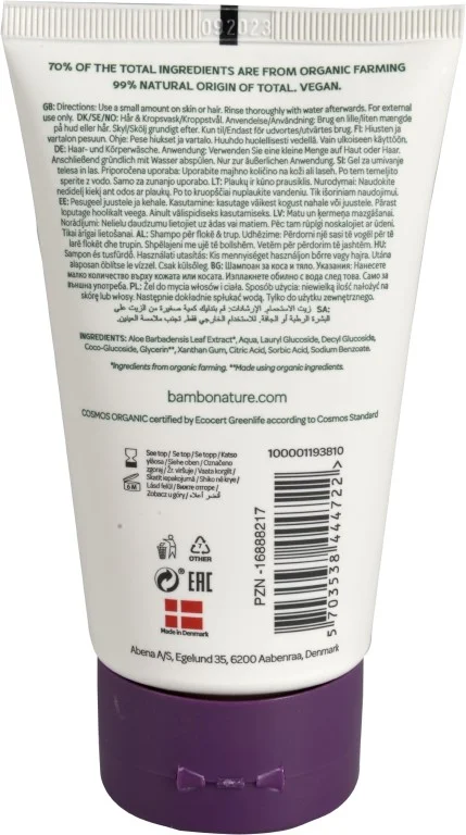 Bambo Nature otroški gel za umivanje telesa in las je izdelek 2 v 1, ki nežno čisti otrokove lase in kožo, ne da bi jo izsušil. Primeren je za dojenčke z občutljivo kožo in lasiščem, ne draži oči, je dermatološko testiran, brez parfumov in barvil ter vsebuje le naravne, rastlinske sestavine. Je veganski izdelek in skladen z Ecocert COSMOS certifikacijskimi standardi.