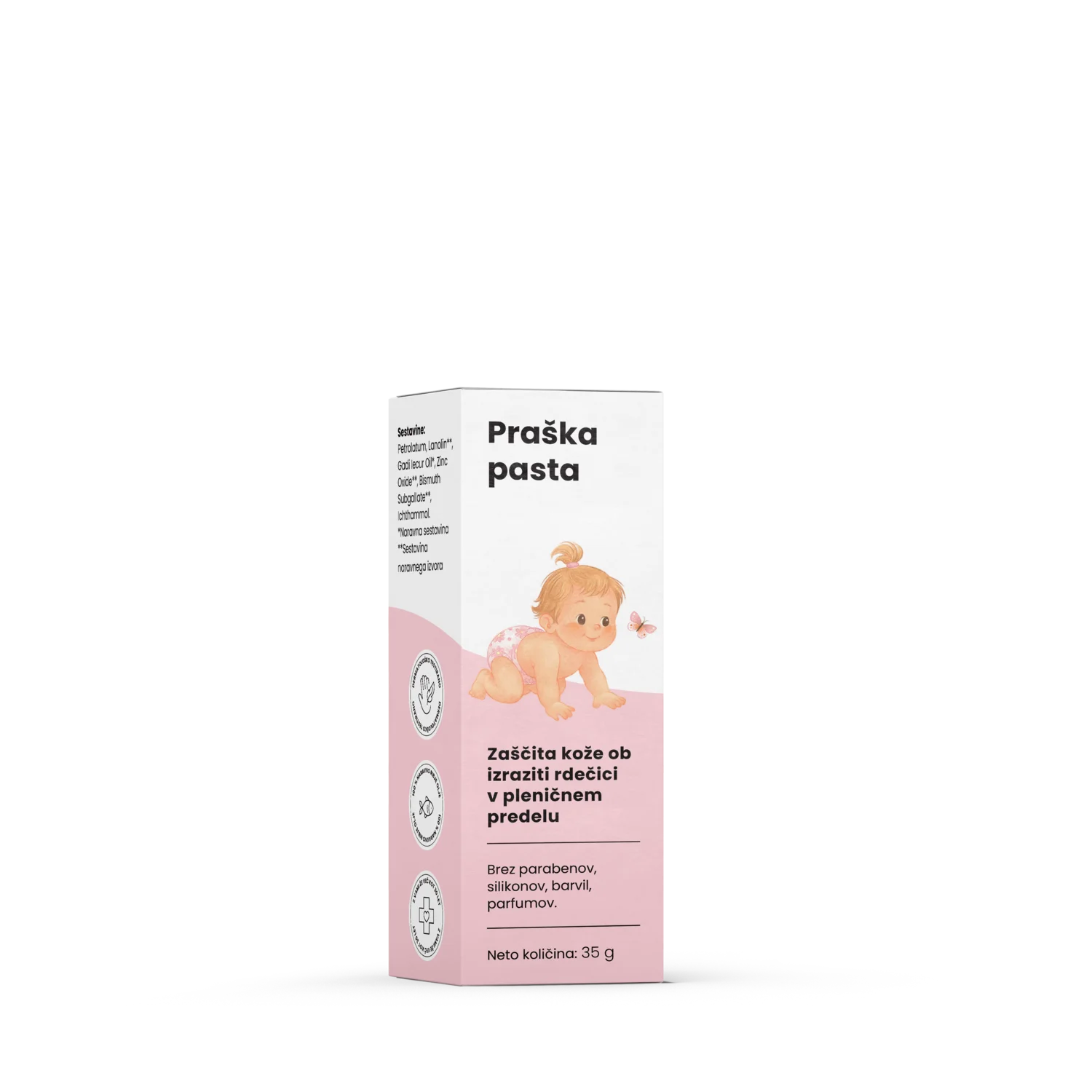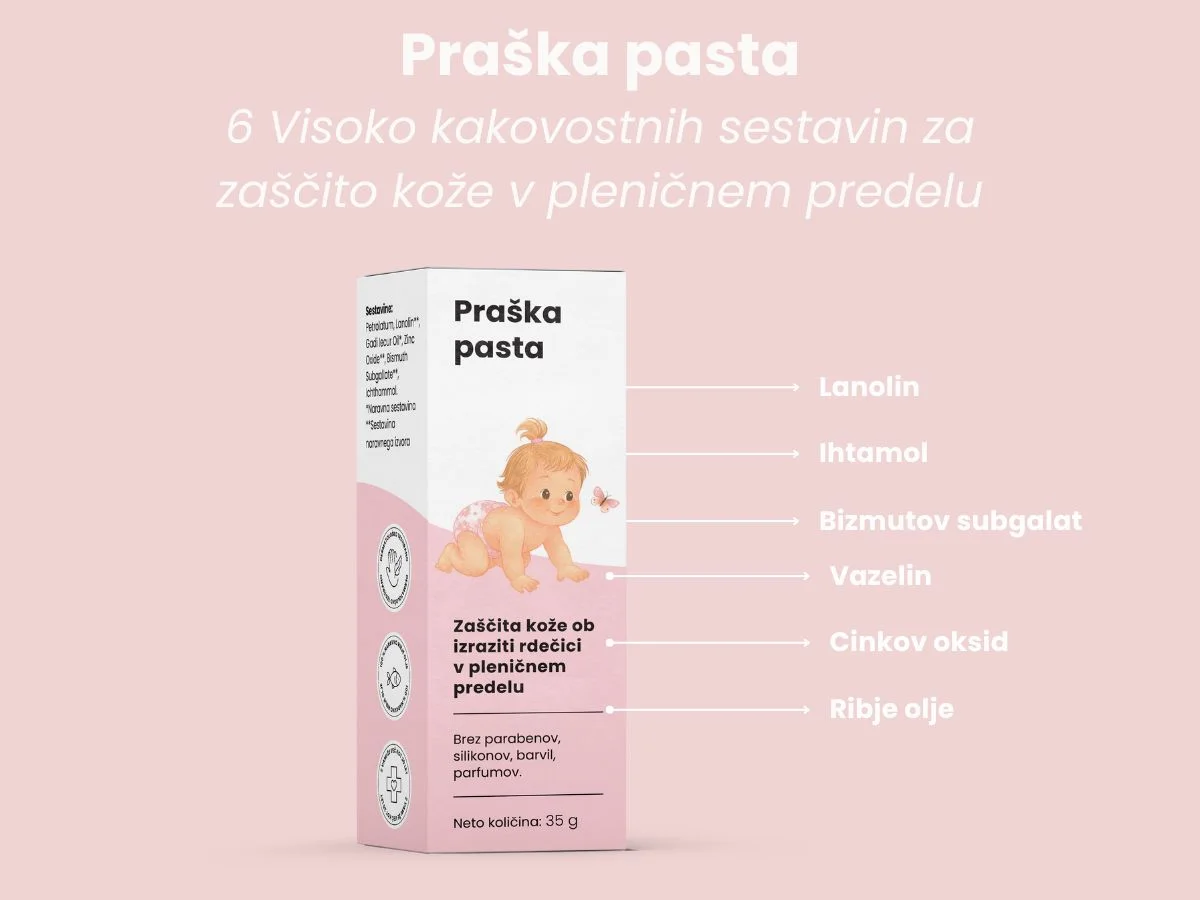 Skrbno izbrane sestavine ščitijo kožo pred vlago, jo pomirjajo in prispevajo k njenemu obnavljanju. Pasta pomaga sušiti razdraženo kožo ter zmanjševati možnost izpuščajev pod plenicami. Po nanosu kožo učinkovito zaščiti in podpira njeno naravno regeneracijo.