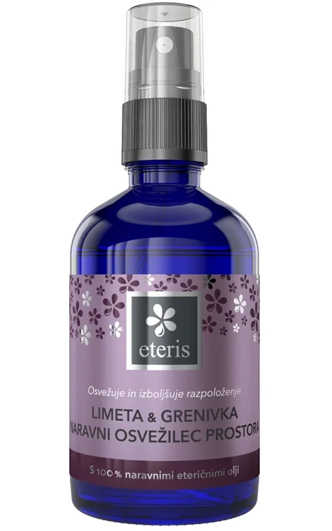 Osvežilec prostora Eteris, limeta & grenivka je naravni osvežilec, ki temelji na načelih aromaterapije in prispeva k prijetnemu vonju ter dobremu počutju v prostoru. Vsebuje skrbno izbrano kombinacijo 100 % naravnih eteričnih olj limete, zelene mete, grenivke in pomaranče, ki osvežujejo zrak, dolgotrajno prekrivajo neprijetne vonjave ter dvigujejo razpoloženje. Njegova sestava ne vsebuje umetnih parfumov, konzervansov, barvil ali škodljivih topil.