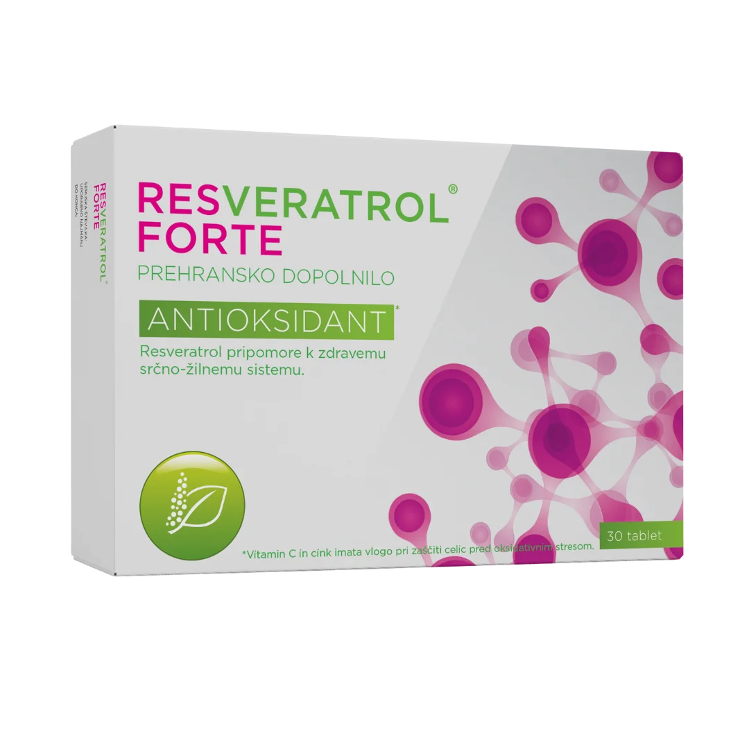 Resveratrol Forte je prehransko dopolnilo, ki vsebuje visoko koncentracijo naravnega trans-resveratrola iz korenine japonskega dresnika. Obogaten je z vitaminom C in cinkom, ki prispevata k zaščiti celic pred oksidativnim stresom ter k ohranjanju zdravja srca in ožilja.